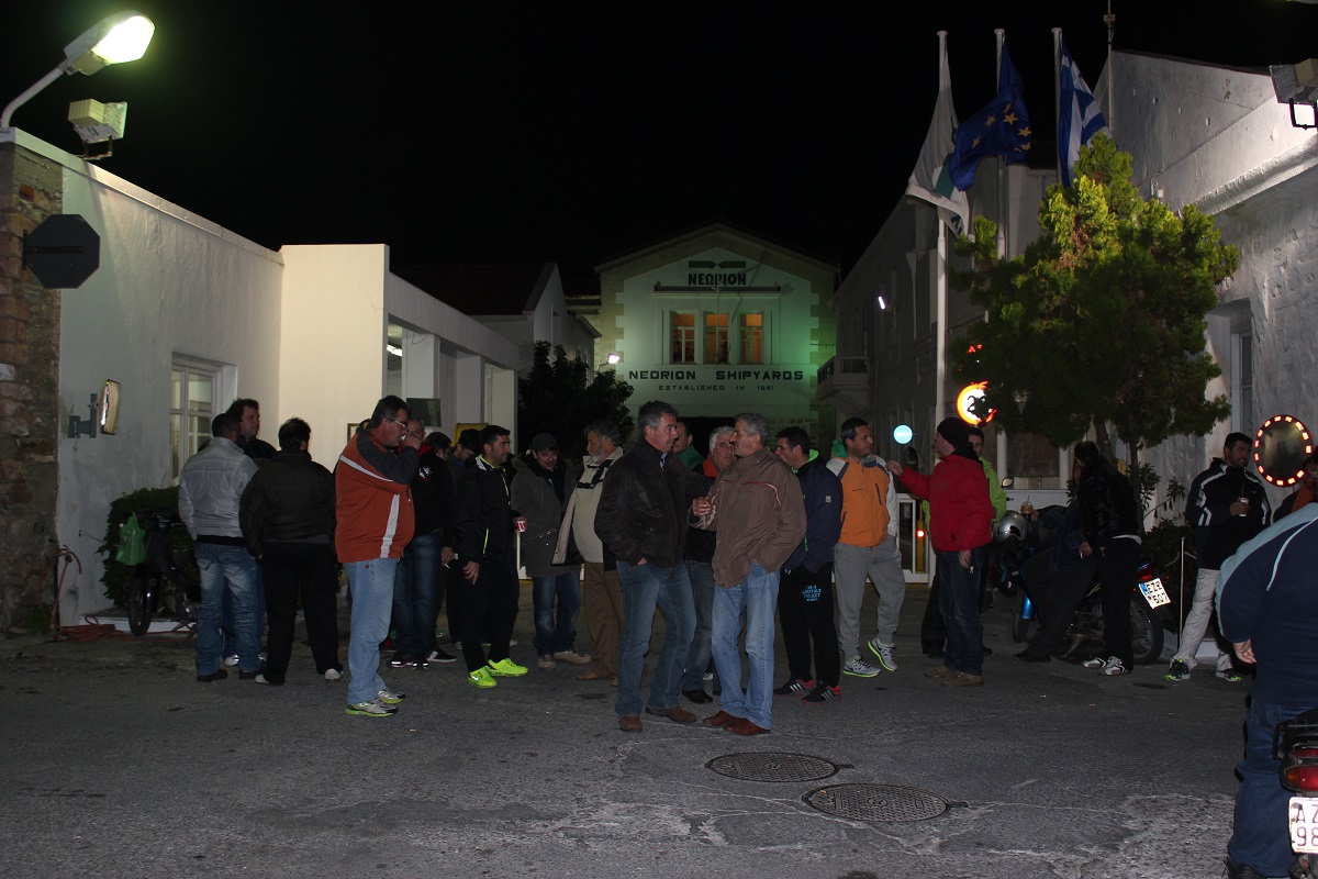 Αργά εχθές το βράδυ έξω από την πύλη του Νεωρίου, πλήθος συγκεντρωμένων εργαζομένων και συνταξιούχων περίμεναν εναγωνίως την εξέλιξη της συζήτησης των εκπροσώπων των δύο πλευρών, εξ αφορμής της μη καταβολής του συνόλου του ποσού που τους οφείλεται, παρά την είσπραξη των πρώτων 5 εκ. ευρώ από το έργο των δύο δεξαμενών.