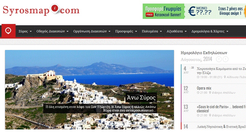 Το www.syrosmap.com είναι ο online ταξιδιωτικός σύμβουλος που προσφέρει πληροφορίες, στοιχεία επικοινωνίας και προτάσεις για να μετατρέψει κάποιος επισκέπτης το ταξίδι του στη Σύρο σε μία ξεχωριστή εμπειρία.