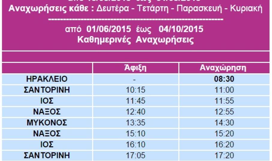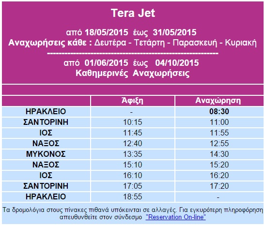 Όπως αναφέρει ανακοίνωση της εταιρίας Sea Jets, το πλοίο Tera Jet, από Δευτέρα, 18 Μαΐου έως την Κυριακή, 31 Μαΐου θα πραγματοποιεί δρομολόγια κάθε Δευτέρα, Τετάρτη, Παρασκευή και Κυριακή, αναχωρώντας στις 8:30 από το λιμάνι του Ηρακλείου της Κρήτης, με προορισμό το λιμάνι της Σαντορίνη στις 10:15, το λιμάνι της Ίου στις 11:45 , το λιμάνι της Νάξου στις 12:40 και το λιμάνι της Μυκόνου στις 13:35.