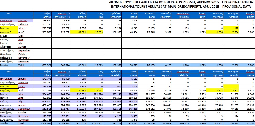 Σε ανάλογο μήκος κύματος – σύμφωνα και με τα μεγέθη και τις δυνατότητες των νησιών – εκπέμπουν και τα νησιά της Ρόδου και της Κω από τα Δωδεκάνησα που ανήκουν στην Περιφέρεια Νοτίου Αιγαίου. Ειδικότερα, η Ρόδος τον φετινό Απρίλιο έχει ήδη υποδεχθεί 61.681 αφίξεις όταν πέρυσι το ίδιο διάστημα οι διεθνείς πτήσεις ανήλθαν σε 58.295. Παρόμοια με τη Μύκονο κινείται και το νησί της Κω γνωρίζοντας μία μικρή πτώση, δεδομένου ότι τον προηγούμενο μήνα τα στοιχεία δείχνουν πως οι αφίξεις πλησίασαν τις 17.299 ενώ τον Απρίλιο του 2014 άγγιξαν τις 23.677.