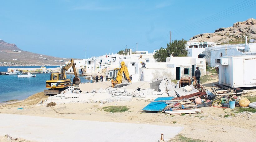 1/4/2014: Οι μπουλντόζες γκρεμίζουν, παρουσία ισχυρών αστυνομικών δυνάμεων, τα αυθαίρετα φτωχόσπιτα των ψαράδων στην παραλία της περιοχής Διβούνια, δίπλα στον Καλαφάτη, και ανοίγουν τον δρόμο για την ανέγερση αυτόνομων βιλών πάνω στο κύμα.
