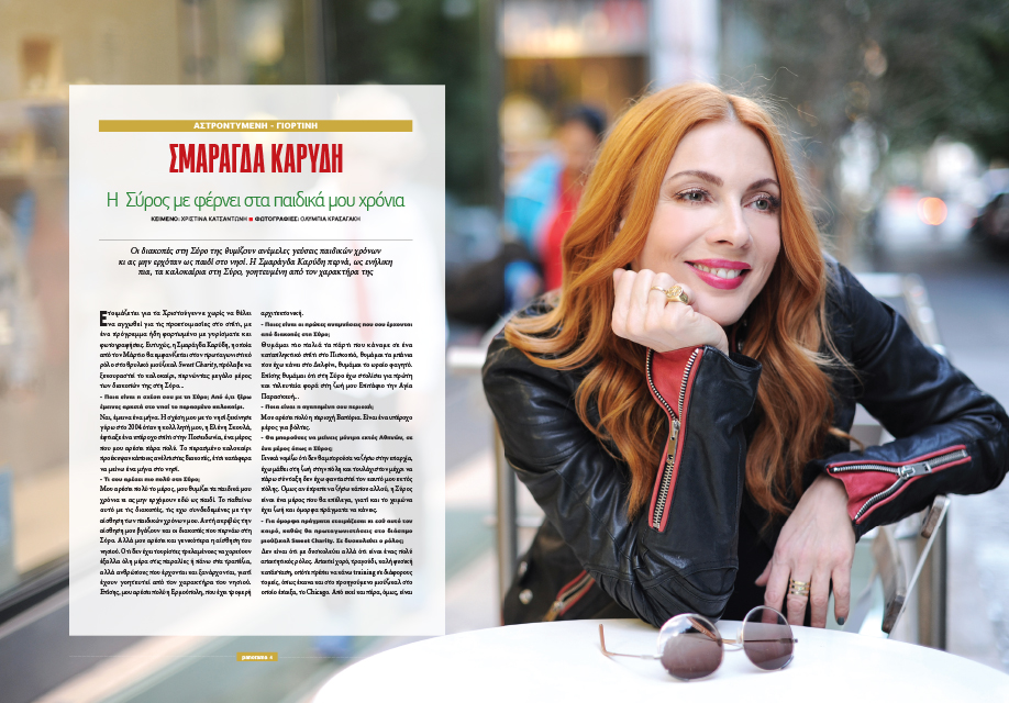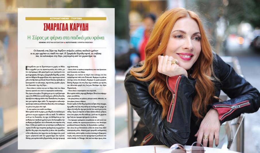 Το εξώφυλλο του περιοδικού κοσμεί μία ακόμη φίλη και συνεργάτιδα του Βαγγέλη Περρή στην εκπομπή «This is Spata», η Μαίρη Συνατσάκη. Η παρουσιάστρια του Ant1 φωτογραφήθηκε στο Δημαρχιακό Μέγαρο της Σύρου και μίλησε τόσο για τη σχέση της με τα social media και τους άντρες, όσο και για τα ιδιαίτερα αισθήματα που τρέφει για την αρχόντισσα των Κυκλάδων.
