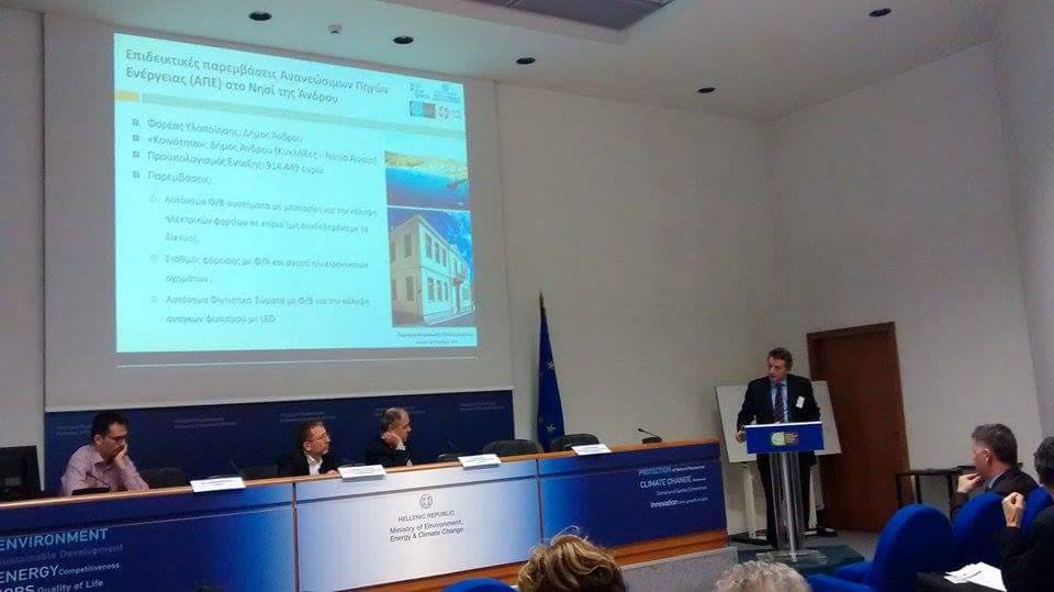 Τα έργα ΑΠΕ, που εντάχθηκαν στο ευρωπαϊκό πρόγραμμα για τις Ανανεώσιμες Πηγές Ενέργειας, παρουσίασε στην εκδήλωση του ΥΠΕΚ, ο Δήμαρχος Άνδρου