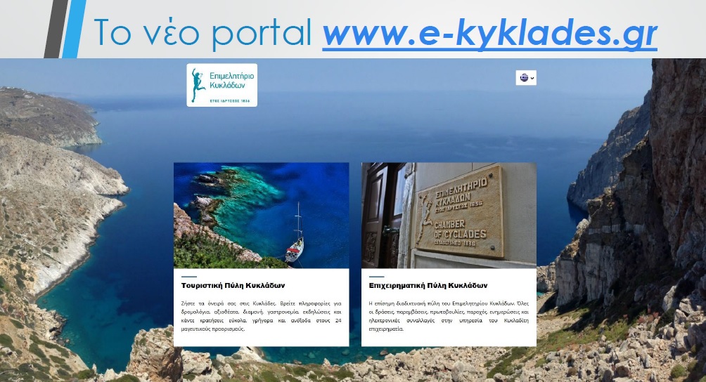 Αέρας ανανέωσης κι εμφανούς αναβάθμισης χαρακτηρίζει και το επιχειρηματικό και τουριστικό portal του Επιμελητηρίου Κυκλάδων, το περιεχόμενο του οποίου εμπλουτίστηκε σημαντικά. Οι κυριότερες αλλαγές εστιάζονται στο πολυγλωσσικό περιεχόμενο (δυνατότητα μετάφρασης σε 7 γλώσσες). Η επίσκεψη και παραμονή των χρηστών σε αυτό (e-kyklades.gr), παρέχει συνεχή κι έγκυρη ενημέρωση σε επιχειρηματικά θέματα, ενώ είναι πλέον εφικτή και η δυνατότητα ηλεκτρονικής διοικητικής εξυπηρέτησης.