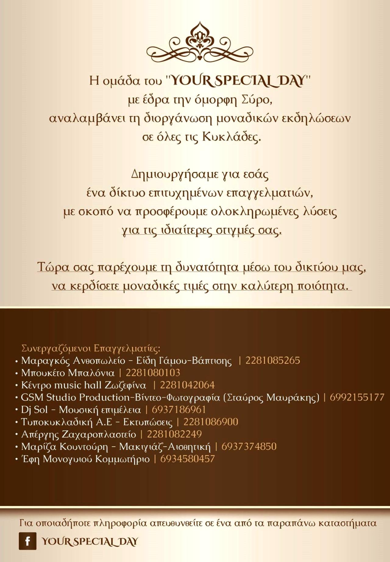 Ωστόσο, η δράση της ομάδας επιχειρήσεων του «Your Special Day», δεν περιορίζει τη δραστηριότητά της μόνο στο νησί της Σύρου, το οποίο αποτελεί έδρα της, αλλά επεκτείνει τις συνεργασίες της σε όλες τις Κυκλάδες, ώστε να καταφέρει να δώσει συμφέρουσες λύσεις σε ανθρώπους, φορείς και επιχειρήσεις και από άλλα νησιά, που θέλουν ποιοτική οργάνωση και εκτέλεση εκδήλωσης, από επιτυχημένους επαγγελματίες, με πολύχρονη εμπειρία, ο καθένας στο δικό του χώρο.