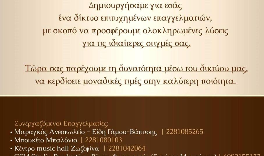 Η συνταγή, απλή. Επαγγελματίες και επιχειρήσεις, από διαφορετικούς χώρους, ενώνουν τις δυνάμεις τους, προκειμένου να παρέχουν στον πελάτη, ένα ολοκληρωμένο αποτέλεσμα, από την αρχή μέχρι το τέλος, με την καλύτερη ποιότητα, σε μοναδικές τιμές.