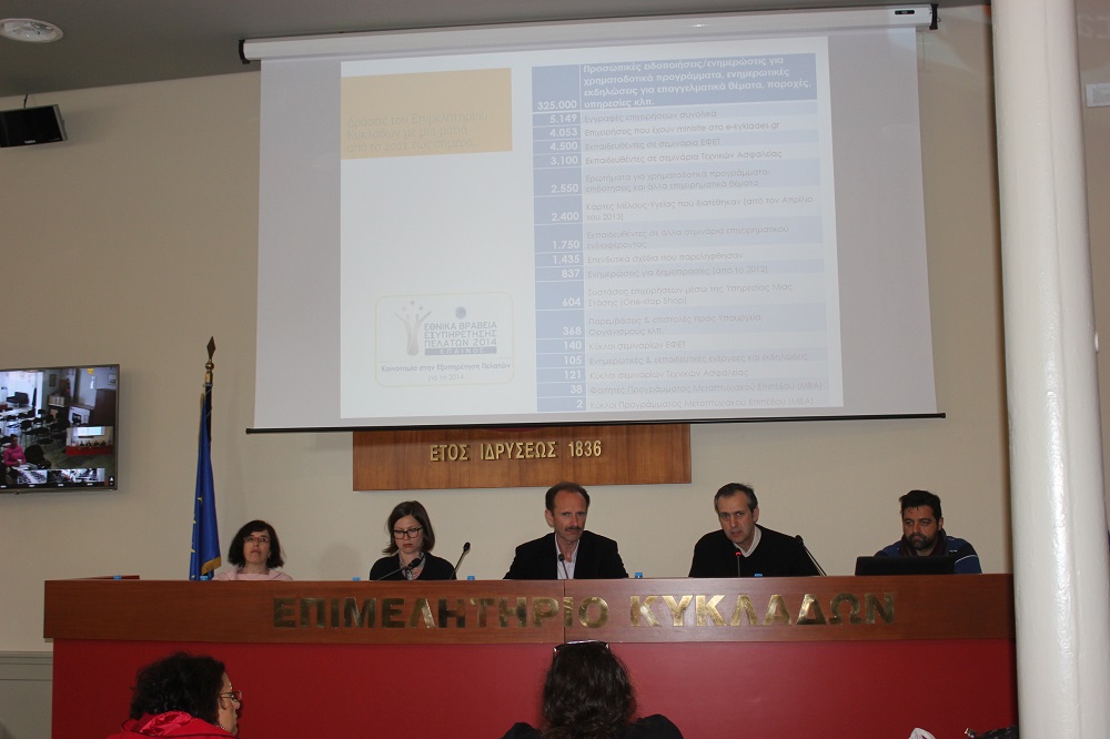 Κατά τη σχεδόν δίωρη παρουσίαση του πακέτου των σύγχρονων υπηρεσιών του Επιμελητηρίου προς τα μέλη του, η οποία πραγματοποιήθηκε με ταυτόχρονη διασύνδεση των συνεδριακών αιθουσών σε Σύρο, Άνδρο, Μήλο, Μύκονο, Νάξο, Πάρο, Σαντορίνη και Τήνο, αναφέρθηκαν και αρκετά στοιχεία που αποτυπώνουν τη σταθερή προσπάθεια εξωστρέφειας που επιχειρεί η διοίκηση και τα στελέχη του.