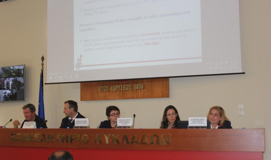 Στην ενημέρωση του συνόλου των ενδιαφερομένων επιχειρηματιών στις Κυκλάδες αναφορικά με τέσσερις νέες δράσεις του Επιχειρησιακού Προγράμματος “Ανταγωνιστικότητα, Επιχειρηματικότητα και Καινοτομία 2014 – 2020” προχώρησε το Επιμελητήριο Κυκλάδων από κοινού με την Εταιρεία Ανάπτυξης και Προόδου Κυκλάδων (ΕΤΑΠ) το μεσημέρι του Σαββάτου, με τους υπεύθυνους ομιλητές να παρουσιάζουν τα βασικά σημεία στους παρευρισκομένους των γραφείων του Επιμελητηρίου σε Σύρο, Άνδρο, Θήρα, Μήλο, Μύκονο, Νάξο και Πάρο.