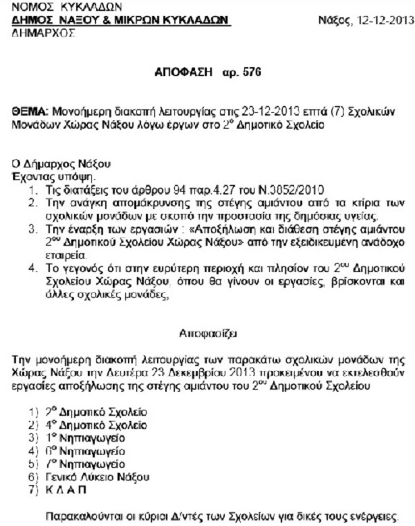 Οι εργασίες αφαίρεσης και αποξήλωσης της στέγης αμιάντου από το 2ο Δημοτικό σχολείο στη Χώρα Νάξου πρόκειται να υλοποιηθούν στις 23 Δεκεμβρίου μετά από απόφαση του δήμου Νάξου και Μικρών Κυκλάδων.