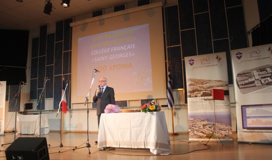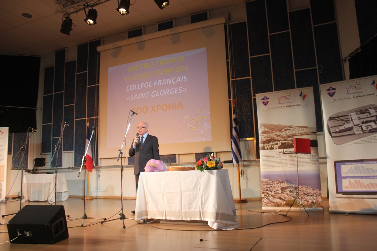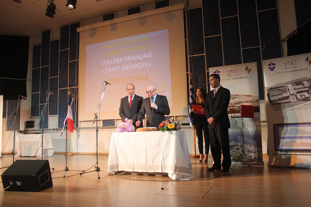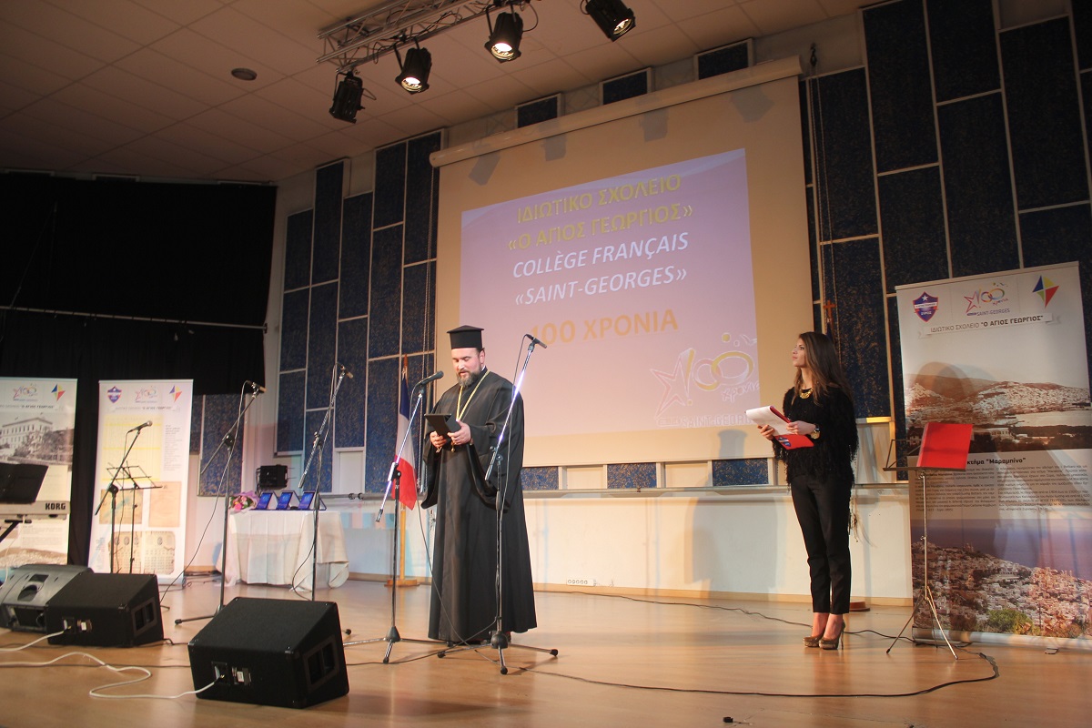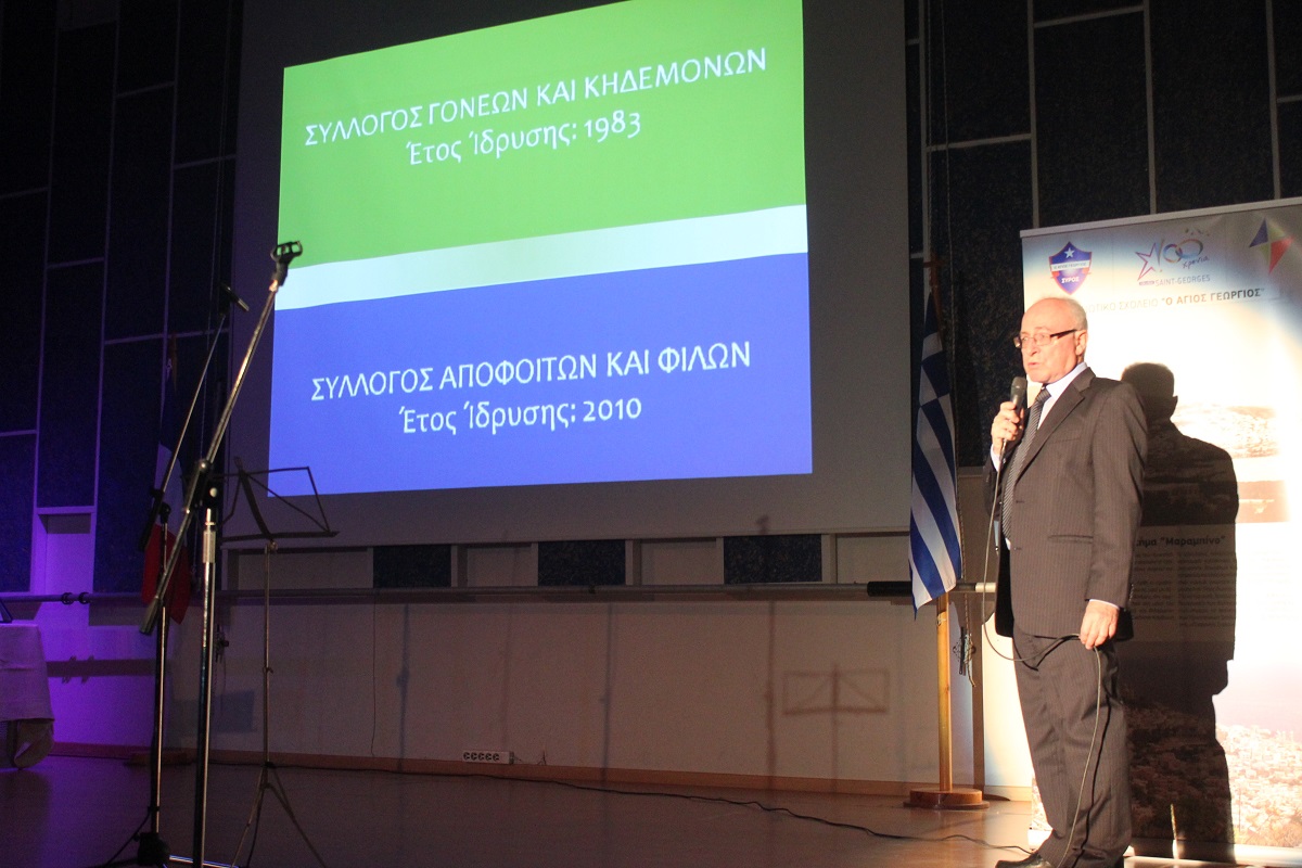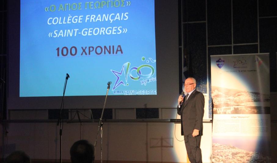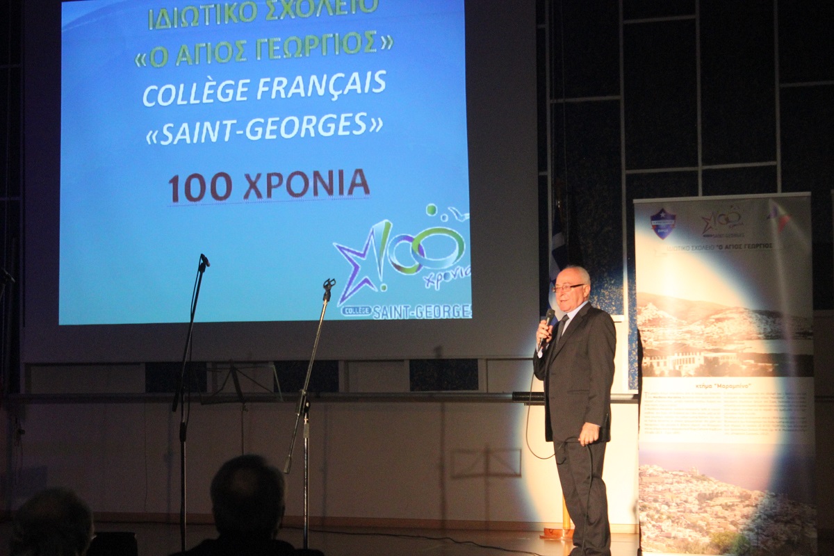 Στην έναρξη της εκδήλωσης, χαιρετισμό απηύθυνε ο πρόεδρος του Συμβουλίου Λασαλιανής Εκπαιδευτικής Αποστολής στην Ελλάδα Frère Nicolas Πρίντεζης, υπεύθυνος του Κολεγίου Δελασάλ στη Θεσσαλονίκη, της Γαλλικής Σχολής Saint – Paul στον Πειραιά και του Δημοτικού σχολείου Δελασάλ στον 'Άλιμο. Στη συνέχεια, το λόγο έλαβε ο Frère Φραγκίσκος, ηγούμενος της Ιεράς Μονής Αγίου Γεωργίου, ο οποίος υπηρέτησε στο σχολείο των Φρερ, 28 ολόκληρα χρόνια, εκ των οποίων τα 17 ως Διευθυντής. Όπως τόνισε, “θα μπορούσαμε να παρουσιάσουμε την ιστορία του σχολείου μας ως μια ζωή ενός υγειούς οργανισμού που μέσα από τις βαθιές εισπνοές και εκπνοές που ανανεώνει τα κύτταρά του και τροφοδοτώντας με το αίμα του κάθε μέρος του, διαιωνίζει ό,τι παράγει ζωή. Ενώ αντίθετα, αποβάλλει ό,τι έχει κουράζει και πεθαίνει. Αυτή την καθημερινή πάλι έδωσε και συνεχίζει να δίνει το σχολείο Άγιος Γεώργιος.