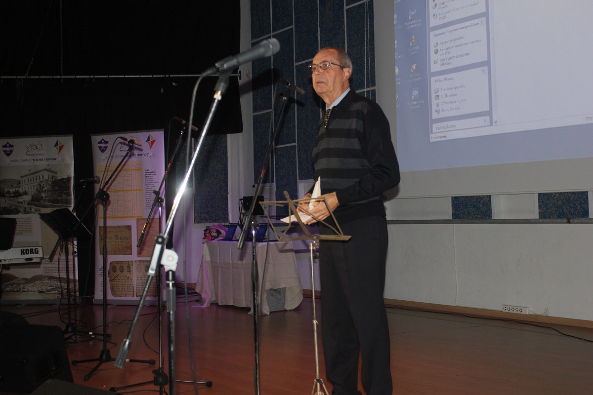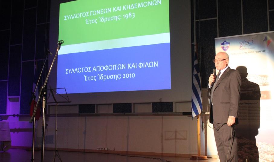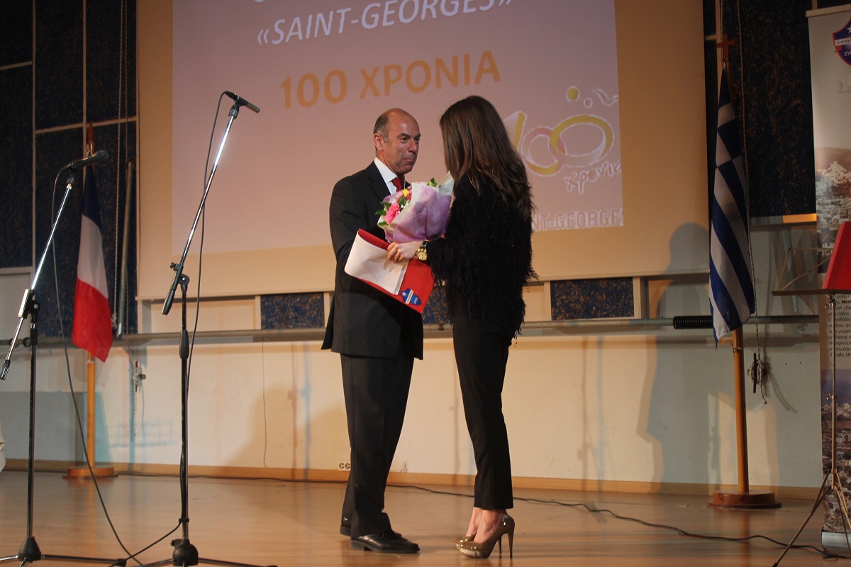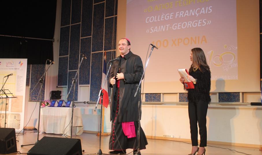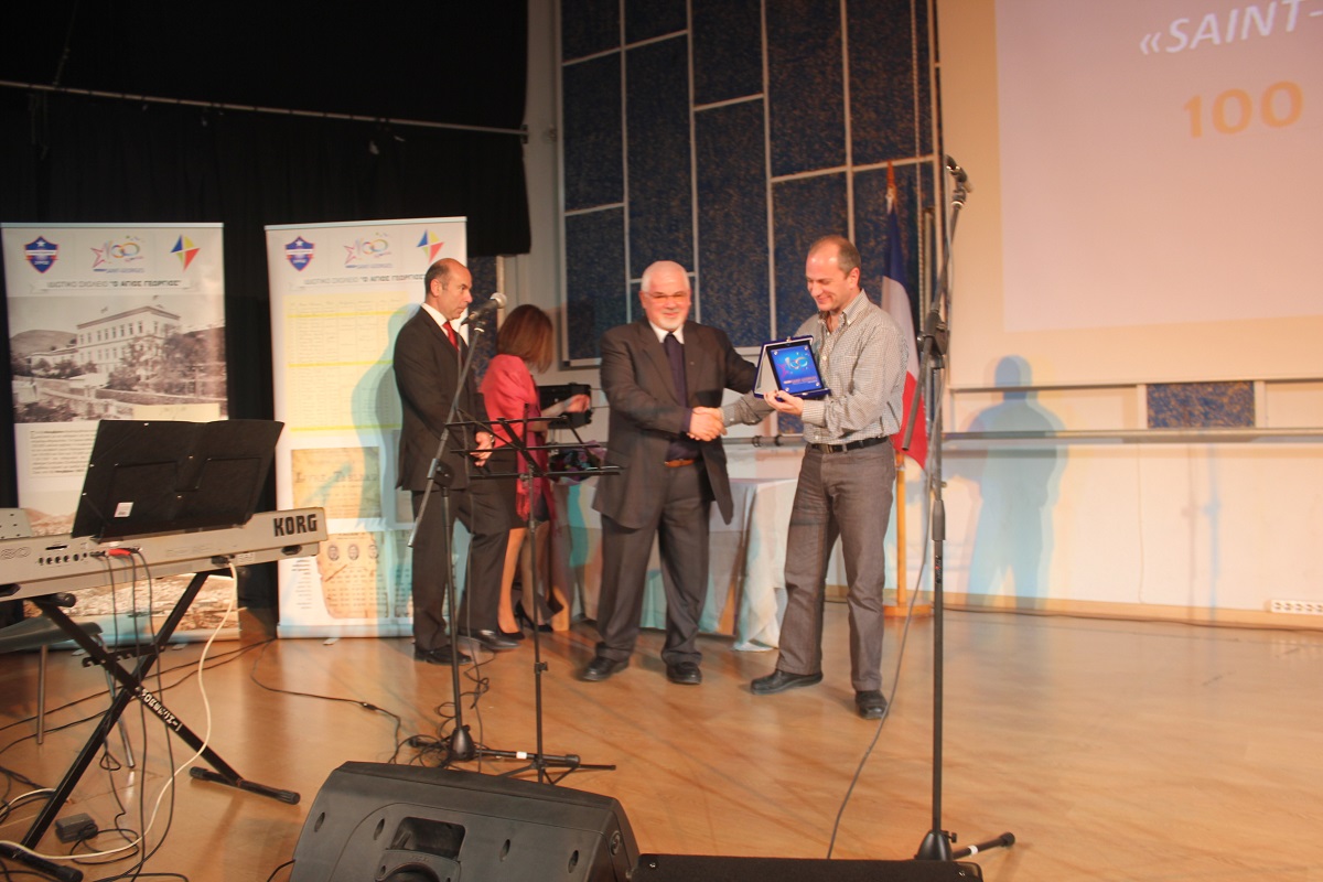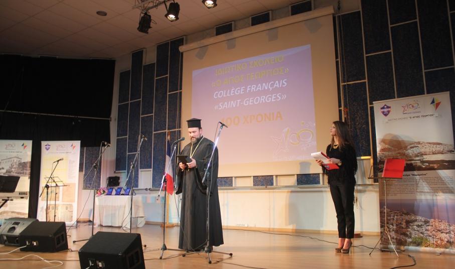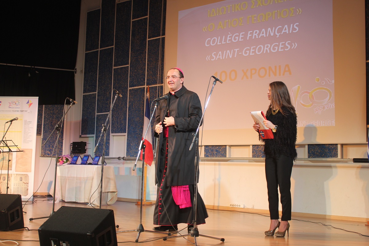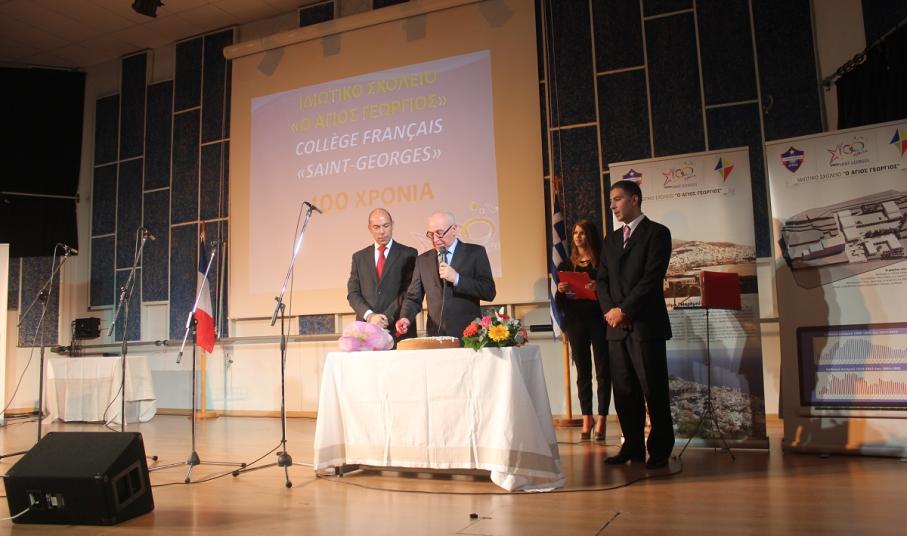 Στην έναρξη της εκδήλωσης, χαιρετισμό απηύθυνε ο πρόεδρος του Συμβουλίου Λασαλιανής Εκπαιδευτικής Αποστολής στην Ελλάδα Frère Nicolas Πρίντεζης, υπεύθυνος του Κολεγίου Δελασάλ στη Θεσσαλονίκη, της Γαλλικής Σχολής Saint – Paul στον Πειραιά και του Δημοτικού σχολείου Δελασάλ στον 'Άλιμο. Στη συνέχεια, το λόγο έλαβε ο Frère Φραγκίσκος, ηγούμενος της Ιεράς Μονής Αγίου Γεωργίου, ο οποίος υπηρέτησε στο σχολείο των Φρερ, 28 ολόκληρα χρόνια, εκ των οποίων τα 17 ως Διευθυντής. Όπως τόνισε, “θα μπορούσαμε να παρουσιάσουμε την ιστορία του σχολείου μας ως μια ζωή ενός υγειούς οργανισμού που μέσα από τις βαθιές εισπνοές και εκπνοές που ανανεώνει τα κύτταρά του και τροφοδοτώντας με το αίμα του κάθε μέρος του, διαιωνίζει ό,τι παράγει ζωή. Ενώ αντίθετα, αποβάλλει ό,τι έχει κουράζει και πεθαίνει. Αυτή την καθημερινή πάλι έδωσε και συνεχίζει να δίνει το σχολείο Άγιος Γεώργιος.