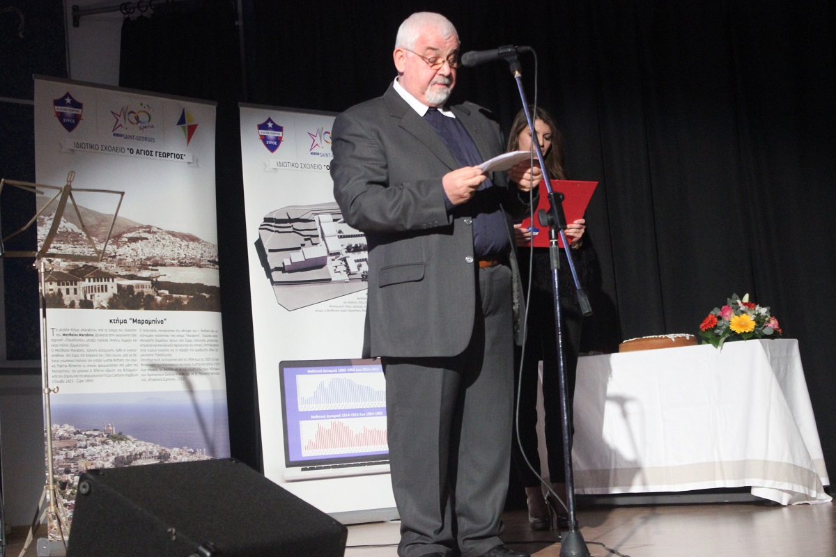 Κατά τη διάρκεια της εκδήλωσης, προβλήθηκε το ιστορικό ντοκιμαντέρ “Η Σύρα στα πρώτα μεταπολεμικά χρόνια”, με την υπογραφή του Αντώνη Αλμπανόπουλου. Το επετειακό λεύκωμα, το οποίο επιμελήθηκε ο Frère Μάριος Καπέλλας, παρουσίασε ο Συριανός δημοσιογράφος και τηλεπαρουσιαστής Βαγγέλης Περρής. Στη συνέχεια, ο Γενικός Διευθυντής του Σχολείου έκανε μια ιστορική διαδρομή του σχολείου “Άγιος Γεώργιος”, ενώ λίγα λεπτά αργότερα το κοινό είχε την ευκαιρία να απολαύσει μαθητές σε ένα ξεχωριστό καλλιτεχνικό πρόγραμμα με τη συμμετοχή της Μαρίας Κουσουλάκου και του Νίκου Ρούσσου.