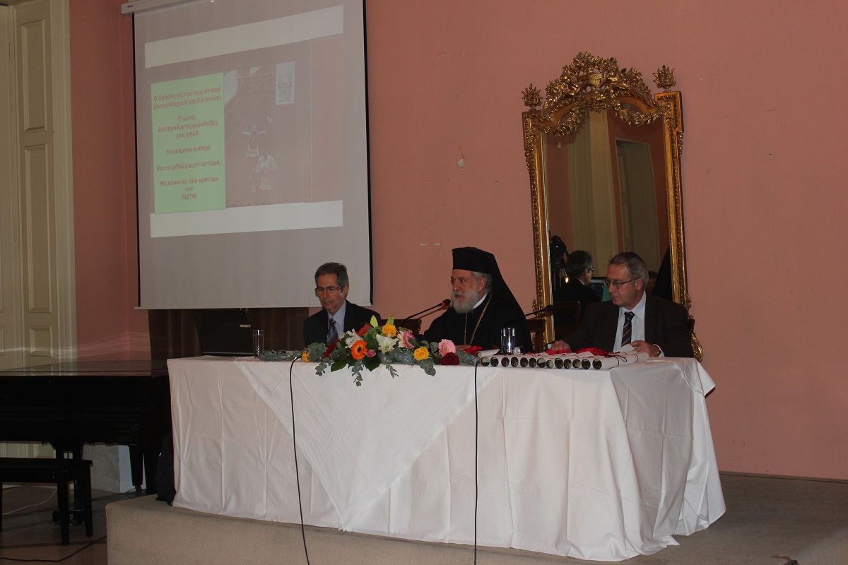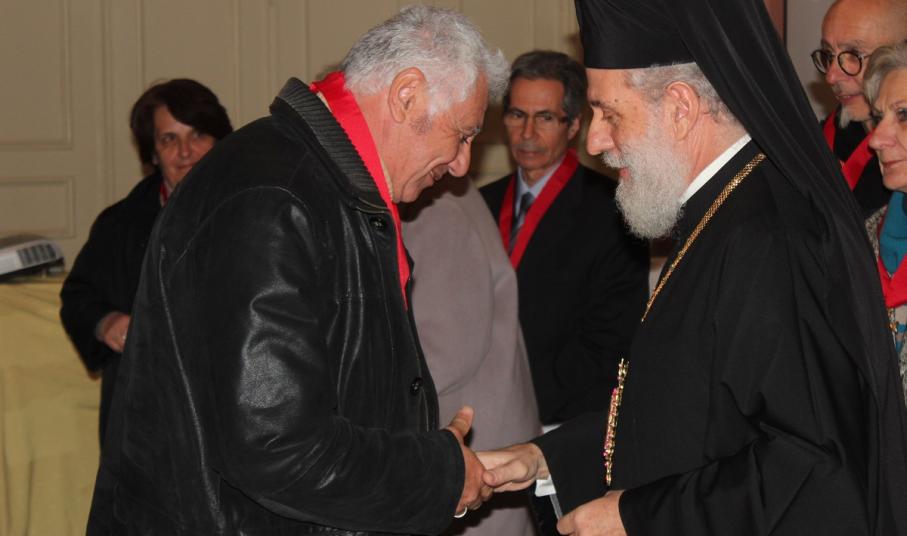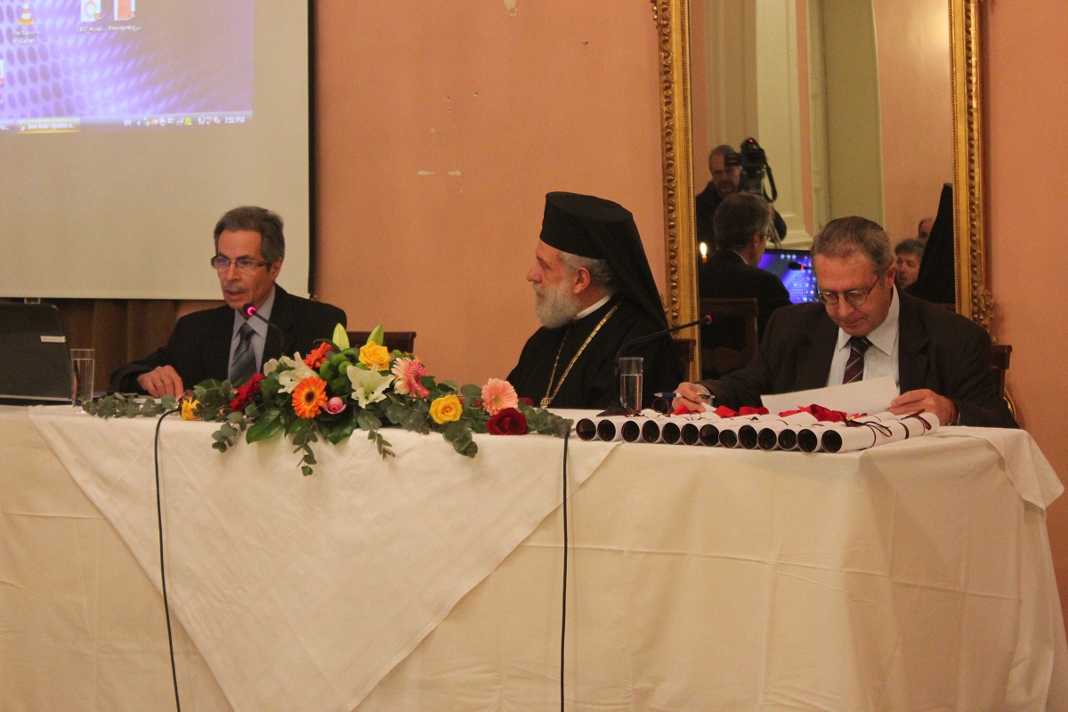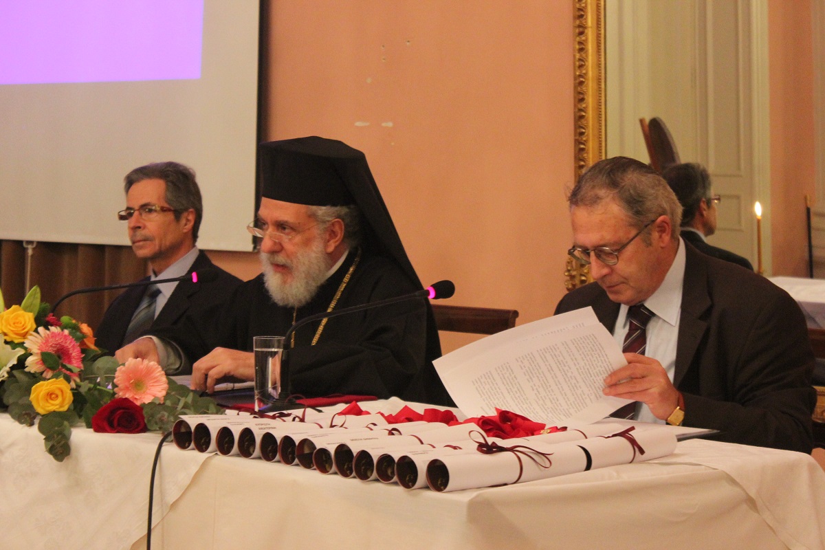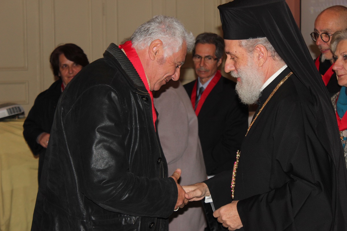 Μετά το τέλος της ομιλίας, ο Σεβασμιώτατος κ. Δωρόθεος Β' απένειμε το Παράσημο της Ιεράς Μητροπόλεως στους συνταξιοδοτηθέντες κατά το παρελθόν έτος 2014 Εκπαιδευτικούς της Σύρου, ως έκφραση ευχαριστιών και αναγνώρισης της προσφοράς τους στην Παιδεία και τους μαθητές, και στον κ. Ιάκωβο Νομικό, για την εύορκη και ευδόκιμο διακονία του στην επιστήμη και τον άνθρωπο.