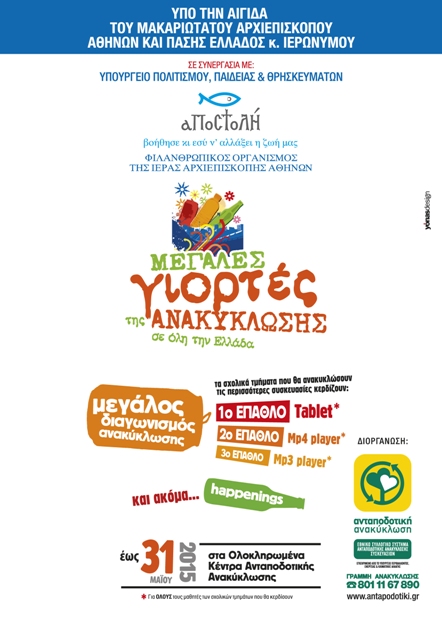 Το πρόγραμμα υλοποιείται από το Εθνικό Συλλογικό Σύστημα Ανταποδοτικής Εναλλακτικής Διαχείρισης Συσκευασιών “Ανταποδοτική Ανακύκλωση”, το οποίο, μεταξύ άλλων, διοργανώνει “Μεγάλες Γιορτές Ανακύκλωσης για τους μαθητές” Δήμων όλης της χώρας από 23 Μαρτίου 2015 έως 31 Μαΐου 2015.