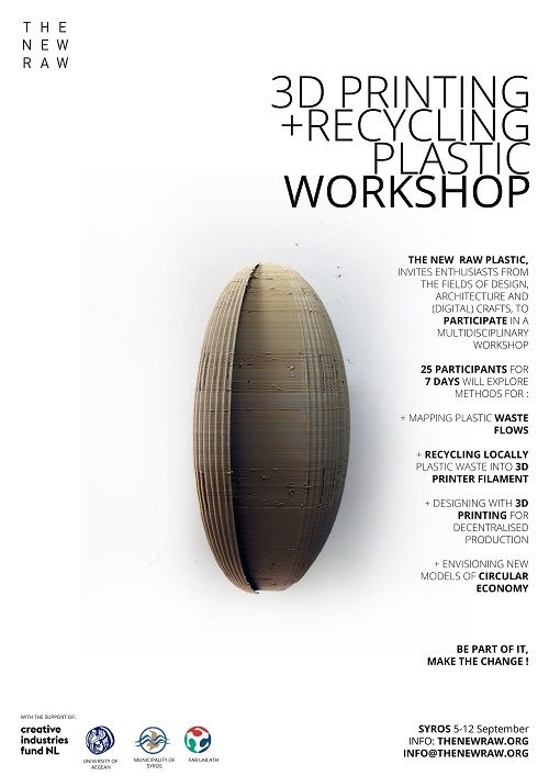 Απαντήσεις σχετικά με την ανακύκλωση πλαστικού 2.0, αλλά και τις δυνατότητες του 3D Printing, θα δοθούν, μεταξύ άλλων, στο πρώτο Διεθνές εργαστήρι ανακύκλωσης πλαστικού για 3d-printing με τίτλο «The New Raw Plastic» το οποίο θα πραγματοποιηθεί στη Σύρο από το Σάββατο 5 Σεπτεμβρίου έως την Κυριακή 13 Σεπτεμβρίου.
