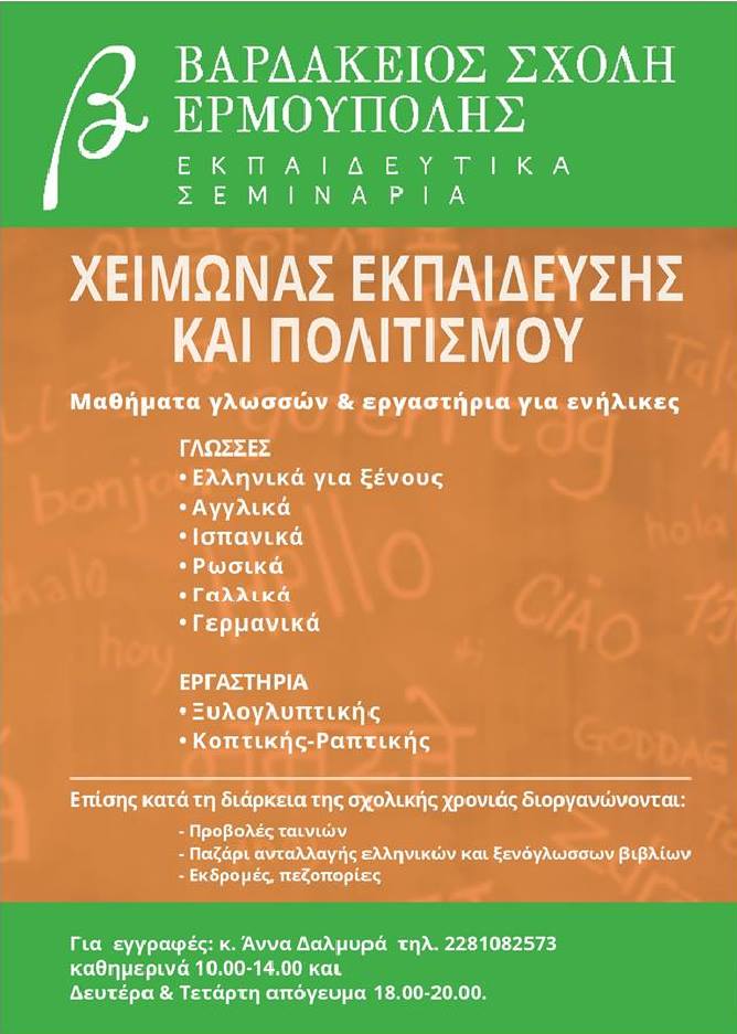 Η Βαρδάκειος Σχολή ανακοινώνει την έναρξη κύκλου μαθημάτων και εργαστηρίων για ενήλικες για το διδακτικό έτος 2015-2016.