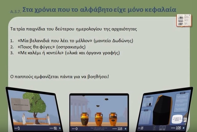Ο φάκελος περιέχει έντυπο διαρθρωμένο σε οκτώ βασικές θεματικές ενότητες που αφορούν στη γέννηση, την εξέλιξη και τη σημασία της γραφής, εικονογραφημένο έντυπο με προτεινόμενες δραστηριότητες, ένα cd-rom με εννιά διαδραστικά παιχνίδια, ένα dvd-rom με μια δεκάλεπτη ταινία κινουμένων σχεδίων και τίτλο «Η μάχη των π».