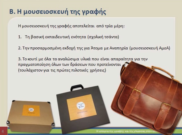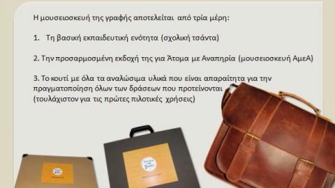 Συγκεκριμένα, πρόκειται για μια μικρή, φορητή, εκπαιδευτική έκθεση – δερμάτινη σχολική τσάντα η οποία περιέχει: 12 αντίγραφα ενεπίγραφων αντικειμένων και δυο σειρές καρτών για καθένας από αυτά, 9 επιπλέον αντικείμενα σχετικά με τη γραφή σε διάφορες χρονικές περιόδους, έντυπο με πληροφορίες για τα εκθέματα και προτάσεις για δραστηριότητες, ταμπλό επιτραπέζιου παιχνιδιού και οι αντίστοιχες κάρτες, φυλλάδια οδηγιών τόσο για τη μουσειοσκευή γενικά, όσο και για το παιχνίδι ειδικά, κουτί με αναλώσιμα υλικά για βιωματικά εργαστήρια με βάση τις προτεινόμενες δραστηριότητες για τις πρώτες πιλοτικές χρήσεις, κουτί με το υλικό της μουσειοσκευής απλοποιημένο και προσαρμοσμένο για ΑμεΑ και ιδιαίτερα για άτομα με προβλήματα όρασης.
