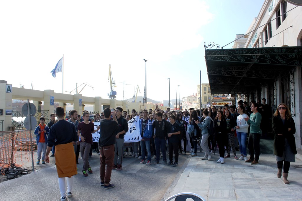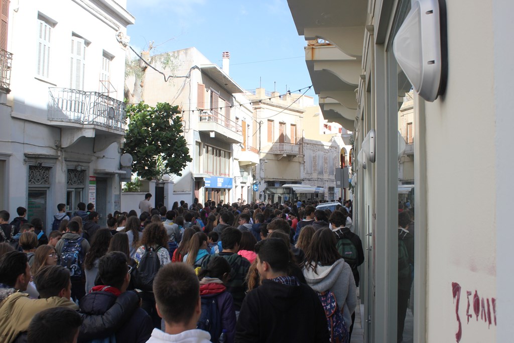Οι μαθητές της Δευτεροβάθμιας εκπαίδευσης, με ιδιαίτερη μαχητικότητα, ξεκίνησαν την πορεία τους το πρωί της Δευτέρας από την οδό Νικηφόρου Μανδηλαρά στο ύψος του ΙΚΑ, όπου πραγματοποίησαν ολιγόλεπτη καθιστική διαμαρτυρία, κλείνοντας τη ροή της Σταματίου Πρωίου προς Λαλακιά, Νικηφόρου Μανδηλαρά και λιμάνι.