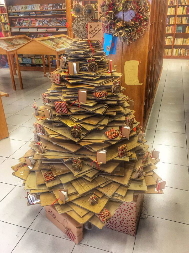 Η ιδέα της κατασκευής ανήκε στη μουσικό κ. Ελένη Βαλδραμίδου, η οποία κατάφερε να την κάνει πράξει σε συνεργασία με τον δάσκαλο φυσικής αγωγής κ. Λάζαρο Λαζαρίδη. Στολίστηκε με δημιουργίες των παιδιών των Α' ,Β', Γ' και Στ' τάξεων με την καθοδήγηση και την ενθάρρυνση των δασκάλων τους. Συνοδεύεται από τις ευχές τόσο των παιδιών, όσο και του εκπαιδευτικού προσωπικού για Χαρούμενες Γιορτές. Ο βασικός κορμός του δέντρου ετοιμάστηκε πριν από δύο χρόνια, ενώ φέτος εμπλουτίστηκε ακόμη περισσότερο. Κυρίαρχο στοιχείο στο δέντρο αποτελεί η «κουκουβάγια», σύμβολο σοφίας και σύνεσης, το οποίο ταιριάζει στο ύφος, το ρόλο και το περιβάλλον της βιβλιοθήκης.