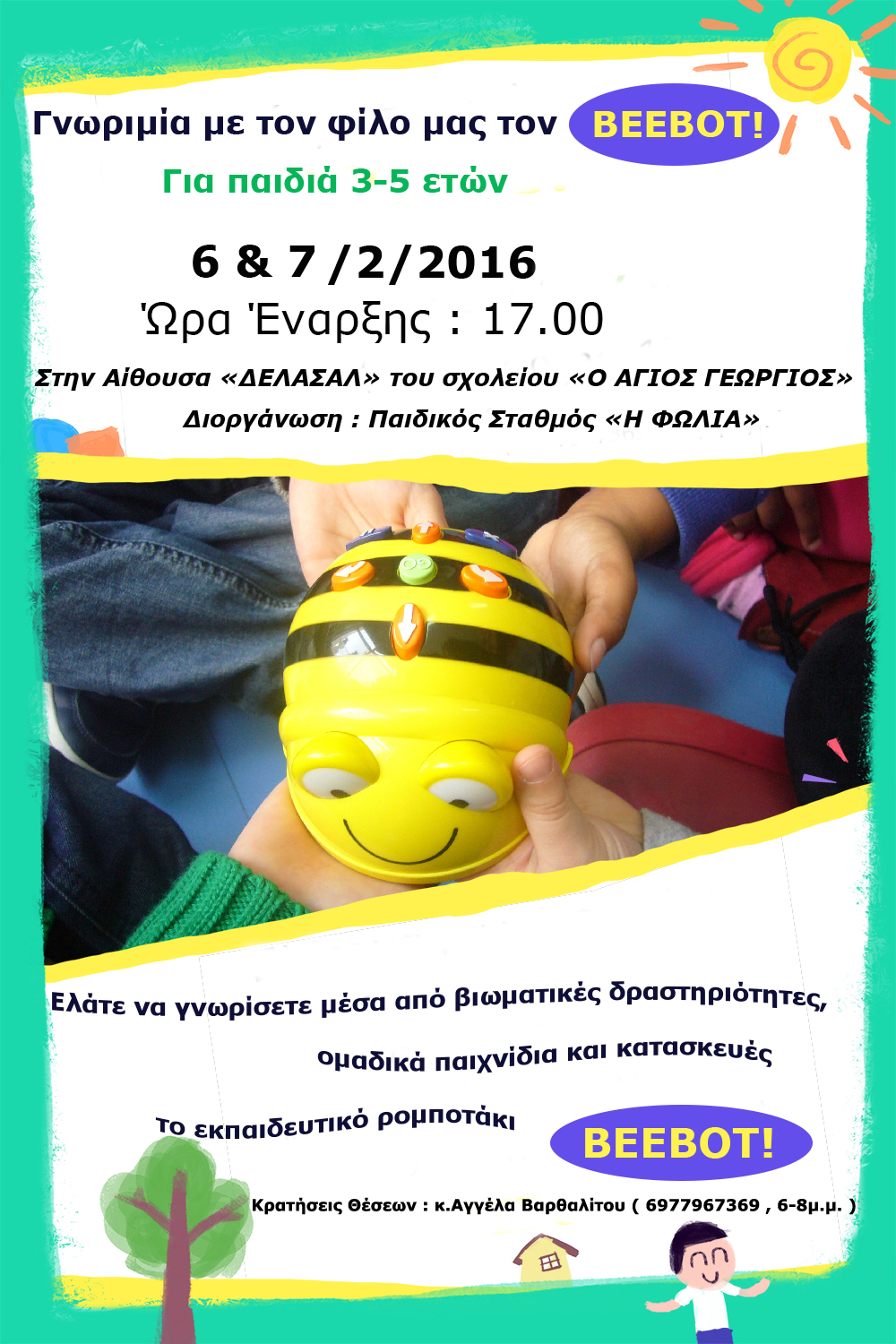 Το Εκπαιδευτικό ρομποτάκι Bee-bot θα έχουν την ευκαιρία να γνωρίσουν για δύο ημέρες οι μαθητές του Παιδικού Σταθμού «Η φωλιά» μέσα από βιωματικές δραστηριότητες, ομαδικά παιχνίδια και κατασκευές που θα πραγματοποιηθούν στις 6 και 7 Φεβρουαρίου 2016 και ώρα 17:00 στην αίθουσα «Δελασάλ» του Ιδιωτικού Σχολείου «Άγιος Γεώργιος».