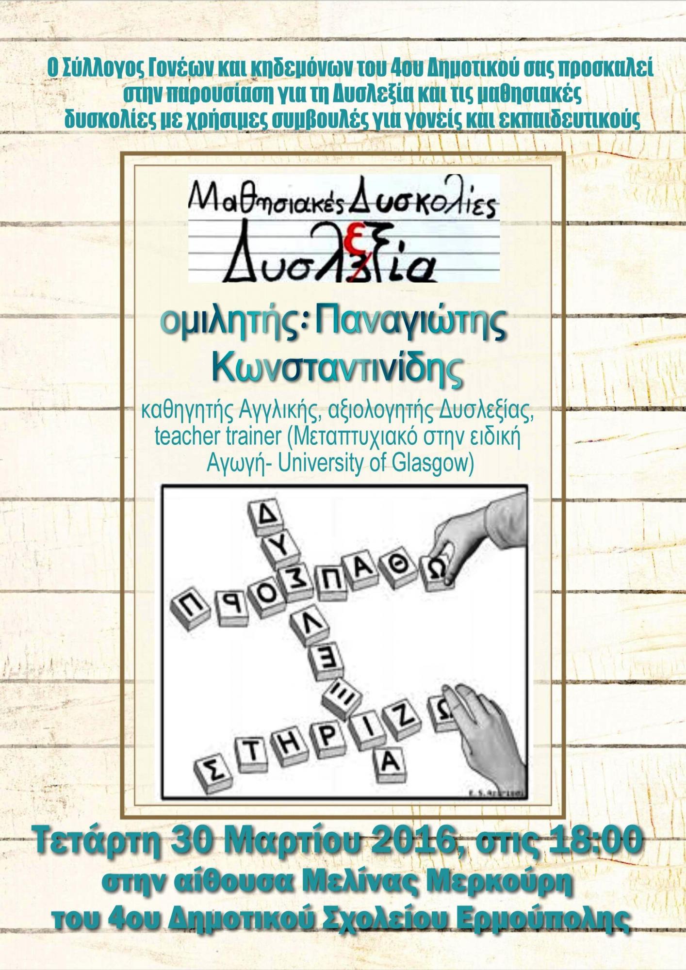 Ο Σύλλογος Γονέων και Κηδεμόνων του 4ου Δημοτικού Σχολείου Ερμούπολης σας προσκαλεί στην παρουσίαση - εκδήλωση για τη δυσλεξία και τις μαθησιακές δυσκολίες με χρήσιμες συμβουλές γονείς κι εκπαιδευτικούς.