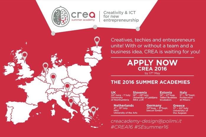 Σκοπός της Θερινής Ακαδημίας είναι η προώθηση νέων επιχειρηματικών ιδεών στους τομείς του πολιτισμού, της τέχνης και της δημιουργικότητας που θα μπορούσαν να αλλάξουν υπάρχουσες πρακτικές ή να δημιουργήσουν νέες στους τομείς αυτούς. Μέσα στην Ακαδημία οι φοιτητές θα αποκτήσουν σημαντικές γνώσεις σχετικά με την επιχειρηματική δράση και την αξιοποίηση καινοτομιών, και να τις εφαρμόσουν ώστε να ξεκινήσουν άμεσα την δική τους επιχειρηματική δραστηριότητα μέσω διαδικασιών startup. Η Θερινή Ακαδημία CREA περιλαμβάνει θέματα όπως: η εφαρμογή του design thinking στη σχεδίαση προϊόντων και υπηρεσιών, μεθοδολογίες και τεχνικές για τη σχεδίαση νέων προϊόντων/υπηρεσιών, δημιουργία επιχειρηματικού μοντέλου, θέματα χρηματοδότησης αρχικού σταδίου, προστασία της πνευματικής και βιομηχανικής ιδιοκτησίας, και στρατηγικές εμπορικής αξιοποίησης. Δικαίωμα συμμετοχής στην Θερινή Ακαδημία έχουν φοιτητές και ομάδες φοιτητών , που σπουδάζουν σε Ελληνικά ή Ευρωπαϊκά Πανεπιστήμια. Η ακαδημία θα διεξαχθεί στην Αγγλική γλώσσα. Για περισσότερες πληροφορίες καθώς και την κατάθεση αιτήσεων παρακαλώ επισκεφθείτε τη σελίδα http://www.creasummeracademy.eu/?page_id=815.