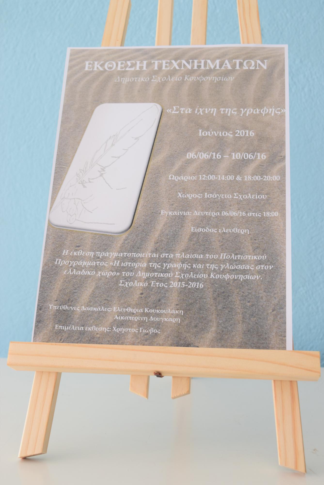 Η έκθεση παρουσιάζεται από 6 έως 10 Ιουνίου 2016 στο πλαίσιο του Πολιτιστικού Προγράμματος του Δημοτικού Σχολείου Κουφονησίου Σχολικό έτος 2015-2016 «Η ιστορία της γραφής και της γλώσσας στον ελλαδικό χώρο».
