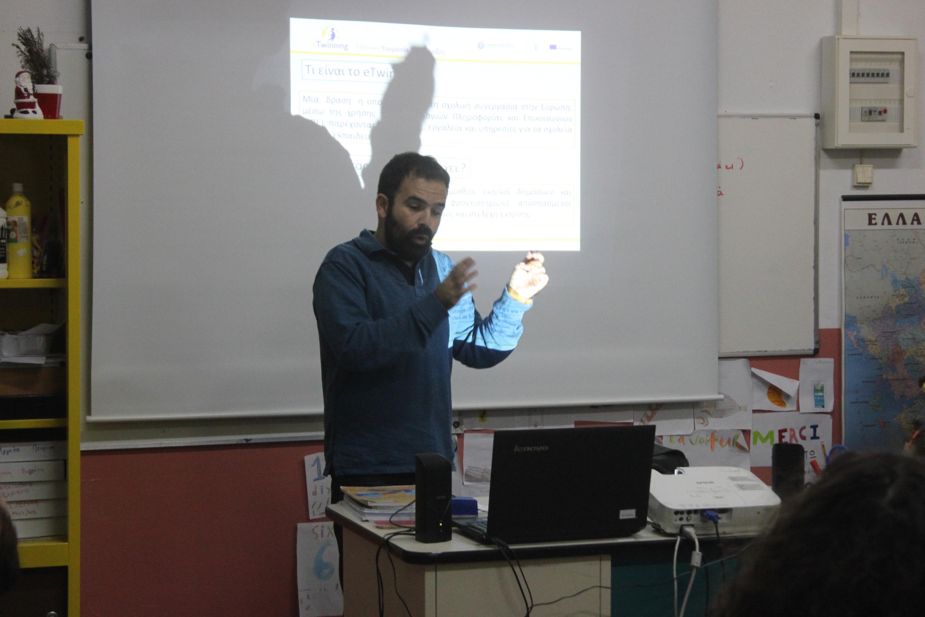 Η επιμορφωτική ημερίδα για τη δράση «eTwinning, η κοινότητα των σχολείων της Ευρώπης» πραγματοποιήθηκε στο Δημοτικό Σχολείο Άνω Σύρο από τον Πρεσβευτή του eTwinning Νοτίου Αιγαίου, Νεκτάριο Φαρασόπουλο.