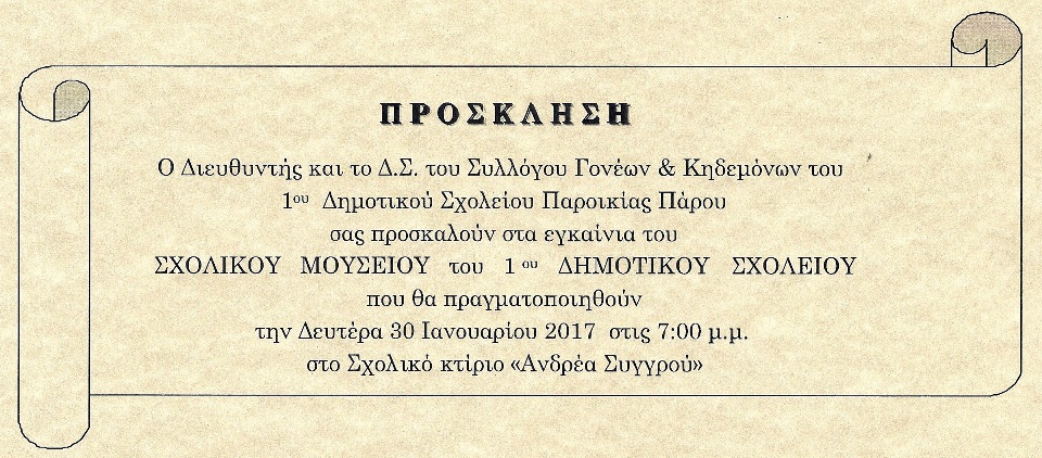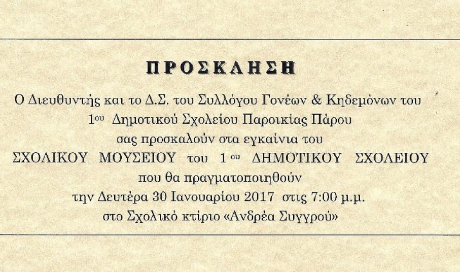 Στις 30 Ιανουαρίου του 2017 προγραμματίστηκαν τα εγκαίνια του σχολικού μουσείου του 1ου Δημοτικού Σχολείου Πάρου.