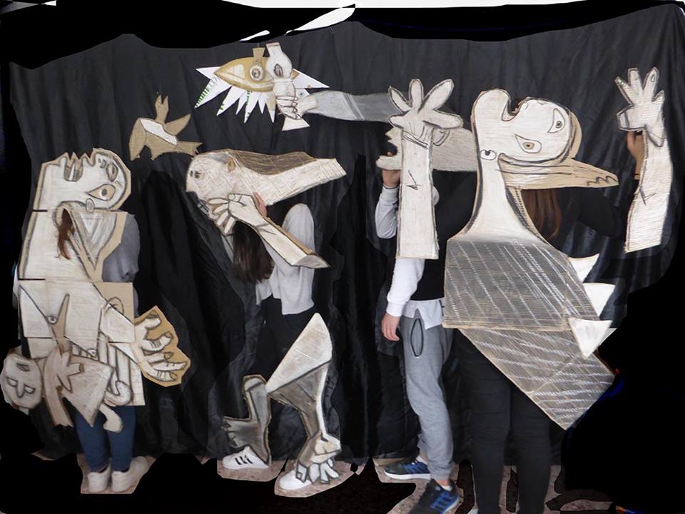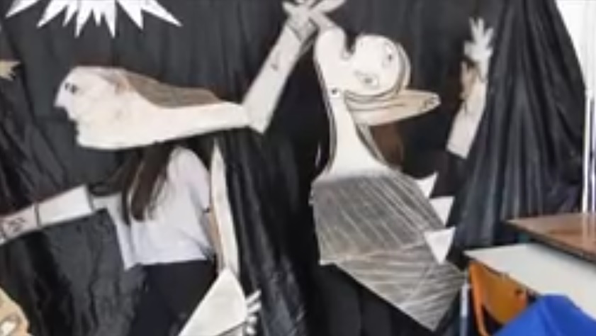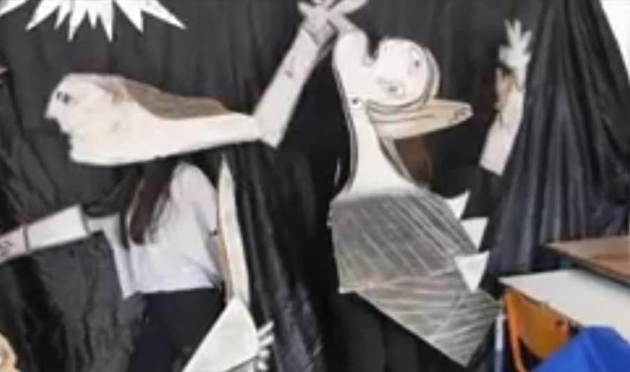 «Το μάθημα των Εικαστικών σου προσφέρει τη δυνατότητα να περάσεις γνώσεις στα παιδιά με βιωματικό τρόπο», αναφέρει χαρακτηριστικά η κ. Κελαϊδή, εξηγώντας ότι η ανασύνθεση της Γκουέρνικα αποτελεί δουλειά δύο ολόκληρων μηνών. «Εστιάζοντας στο έργο του Πικάσο, συσχετίσαμε την πόλη της Γκουέρνικα με την κατάσταση στο Χαλέπι, όπου επικρατεί η ίδια φρίκη του πολέμου με θύματα γυναίκες και παιδιά», προσθέτει.