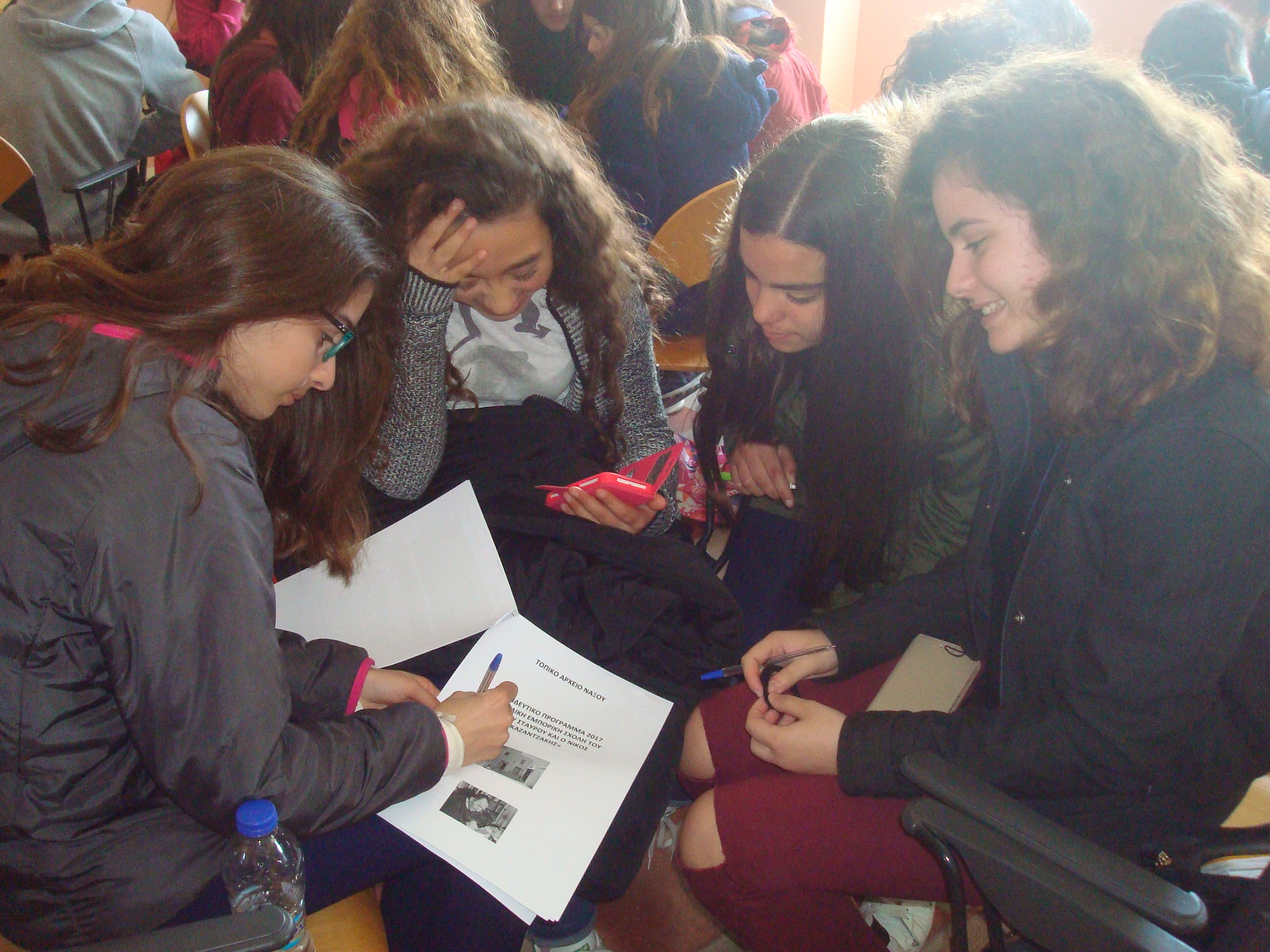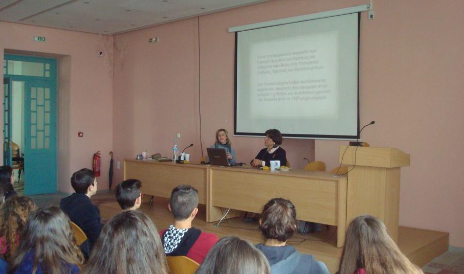 Μεταξύ άλλων, επισκέφτηκαν το Τοπικό Αρχείο Νάξου, μέσα στο Κάστρο, όπου μελέτησαν παλαιά έγγραφα σχετικά με τη Γαλλική Εμπορική Σχολή Τιμίου Σταυρού, στην οποία σπούδασε ο Καζαντζάκης τη διετία 1897-1899. Τα παιδιά βρήκαν τον κανονισμό της σχολής και τον σύγκριναν με τον σημερινό τρόπο λειτουργίας της. Την ομάδα συνόδευσε και η εκπρόσωπος της Διεθνούς Εταιρείας Φίλων Νίκου Καζαντζάκη στην Ελλάδα και ειδική μελετήτρια του έργου του, Αθηνά Βουγιούκα, η οποία επισκέφτηκε τα σχολεία της Νάξου και μίλησε στους μαθητές για γνωστές και άγνωστες πτυχές της ζωής του Έλληνα συγγραφέα.