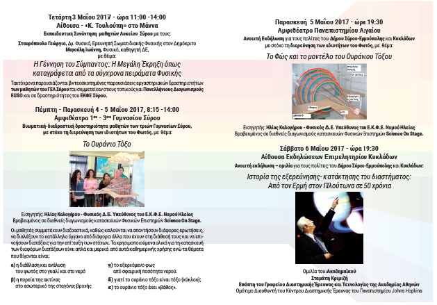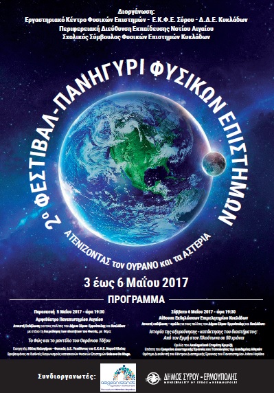 με σκοπό την ανάδειξη της σημασίας και του ρόλου των Φυσικών Επιστημών στην εκπαίδευση και την κοινωνία. Οι εκδηλώσεις θα πραγματοποιηθούν στη Σύρο από την Τετάρτη 03/05/2017 έως και το Σάββατο 06/05/2017, σύμφωνα με το παρακάτω πρόγραμμα: