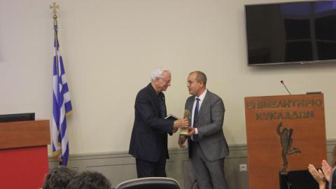 Τον Δήμο εκπροσώπησε ο πρόεδρος του Δημοτικού Συμβουλίου, Γιώργος Δούναβης, ο οποίος ευχαρίστησε τον κ. Κριμιζή και του απένειμε αναμνηστικά δώρα από τη Σύρο.
