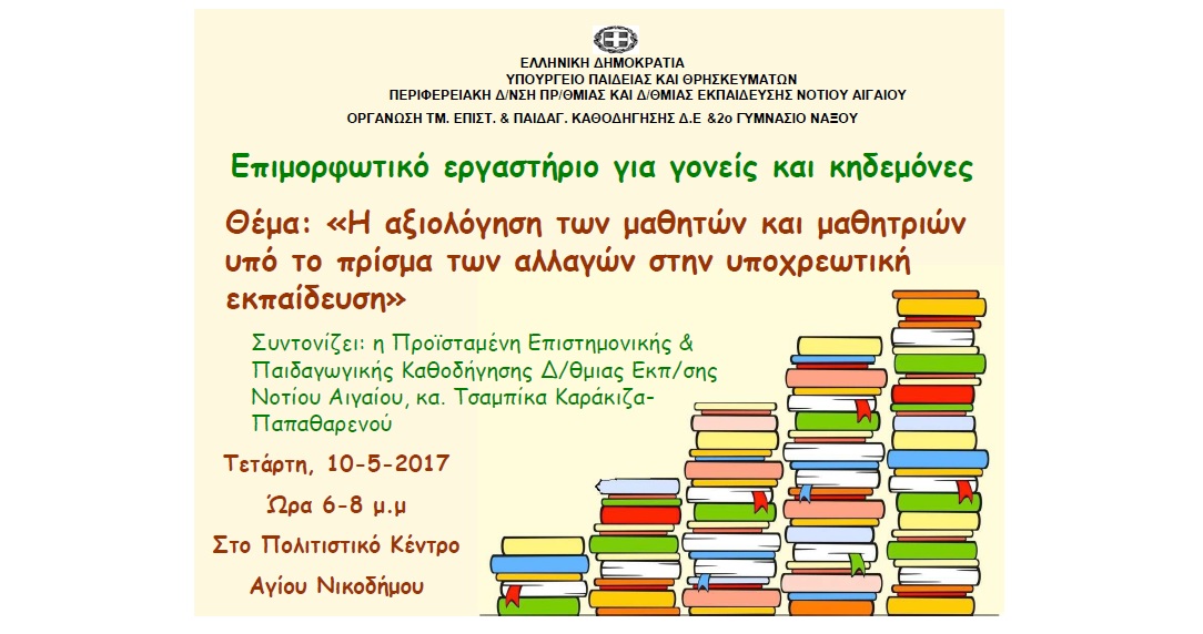 Επιμορφωτικό εργαστήριο για γονείς και κηδεμόνες με θέμα «Η αξιολόγηση των μαθητών και μαθητριών υπό το πρίσμα των αλλαγών στην υποχρεωτική εκπαίδευση», με εισηγήτριες την κ. Παρασκευή Δεληκάρη, Σχολική Σύμβουλο Φιλολόγων Κυκλάδων & κ. Τσαμπίκα Καράκιζα, Προϊσταμένη Επιστημονικής & Παιδαγωγικής Καθοδήγησης Δ/θμιας Εκπ/σης Νοτίου Αιγαίου, θα πραγματοποιηθεί στη Νάξο, την Τετάρτη, 10-5-2017 και ώρα 6-8 μ.μ, στο Πολιτιστικό Κέντρο Αγίου Νικοδήμου.