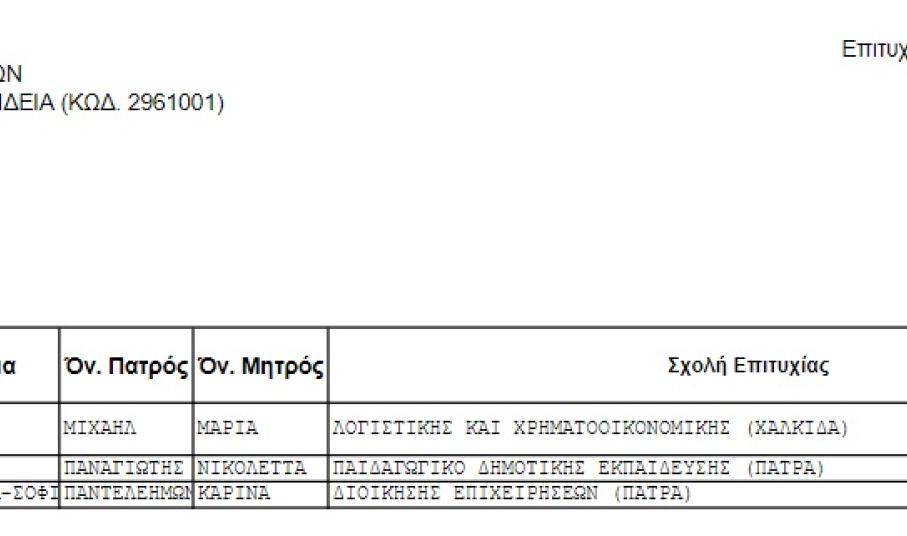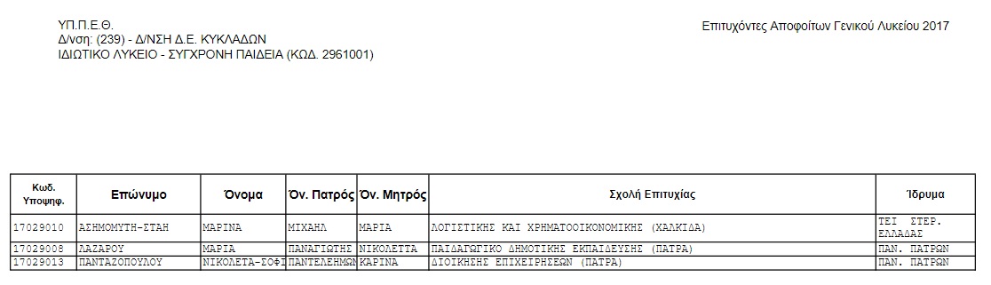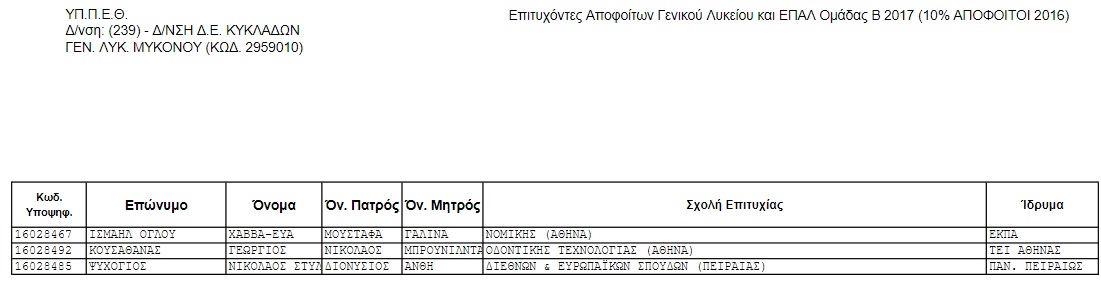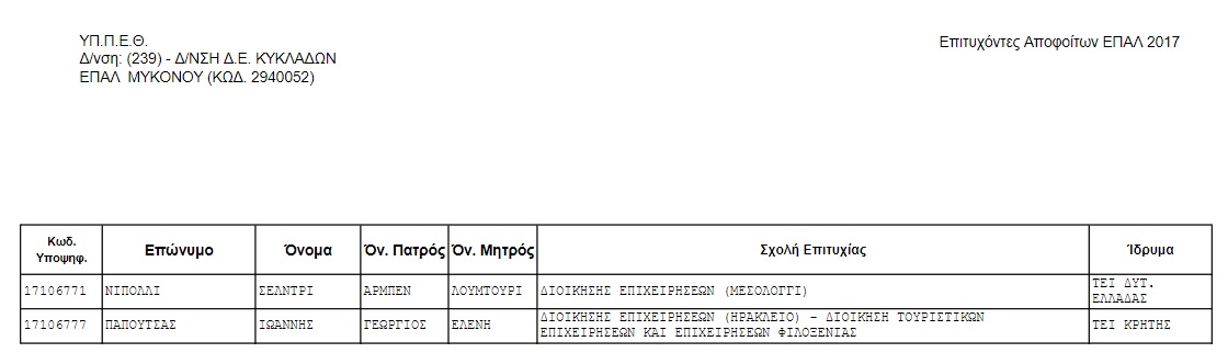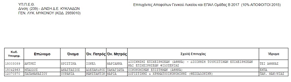 Επιτυχόντες από το Γενικό και Επαγγελματικό Λύκειο Μυκόνου στην Γ'βάθμια Εκπαίδευση