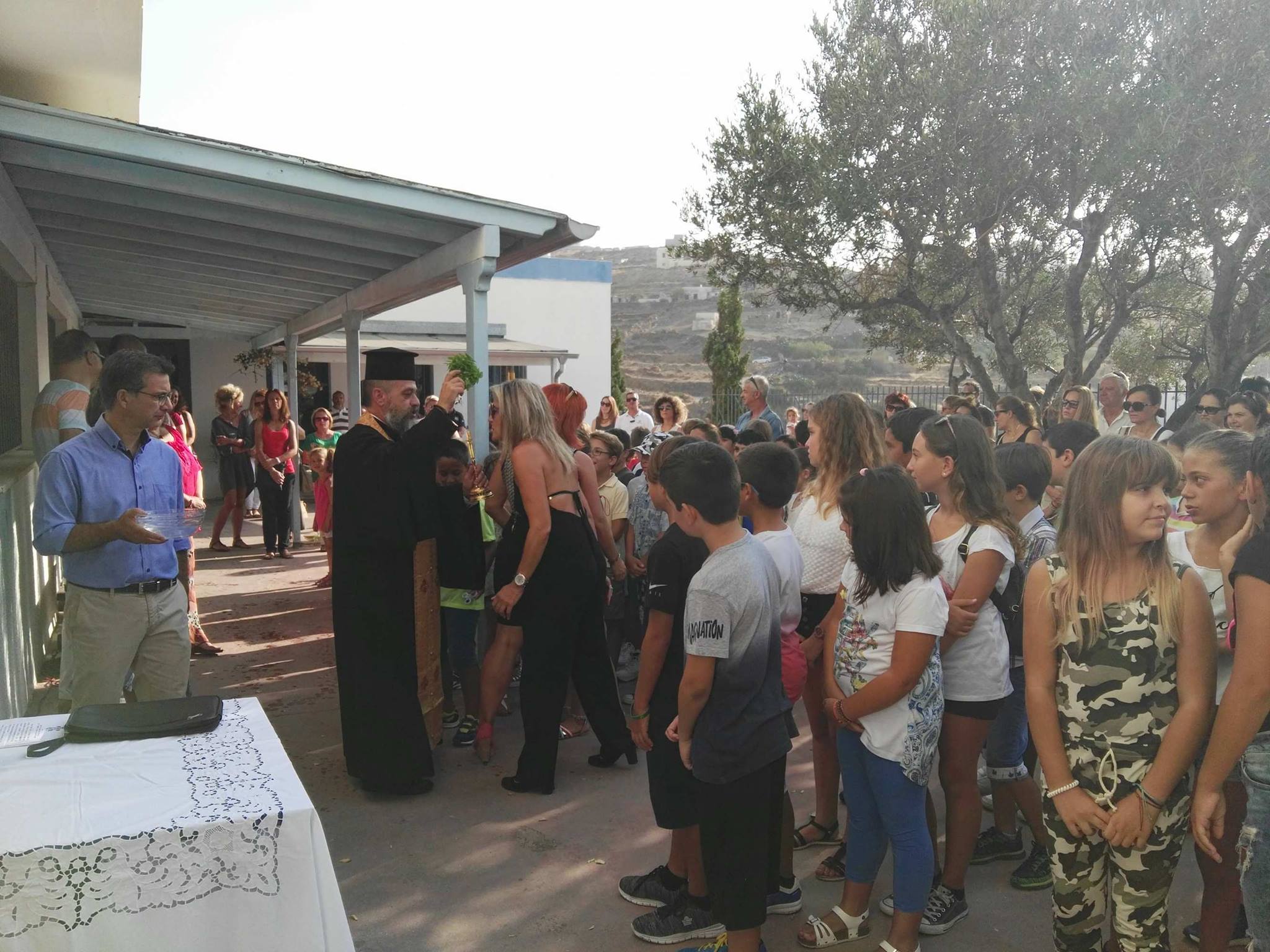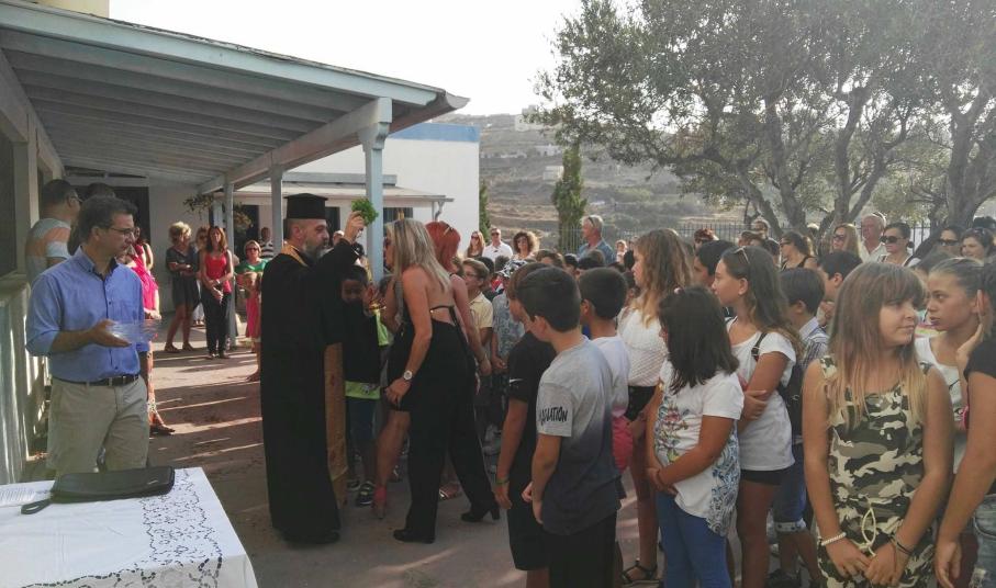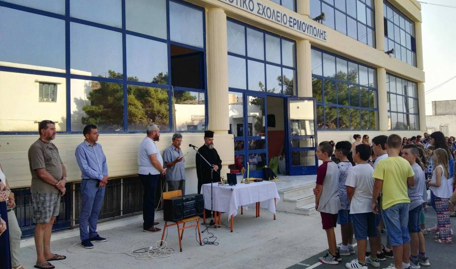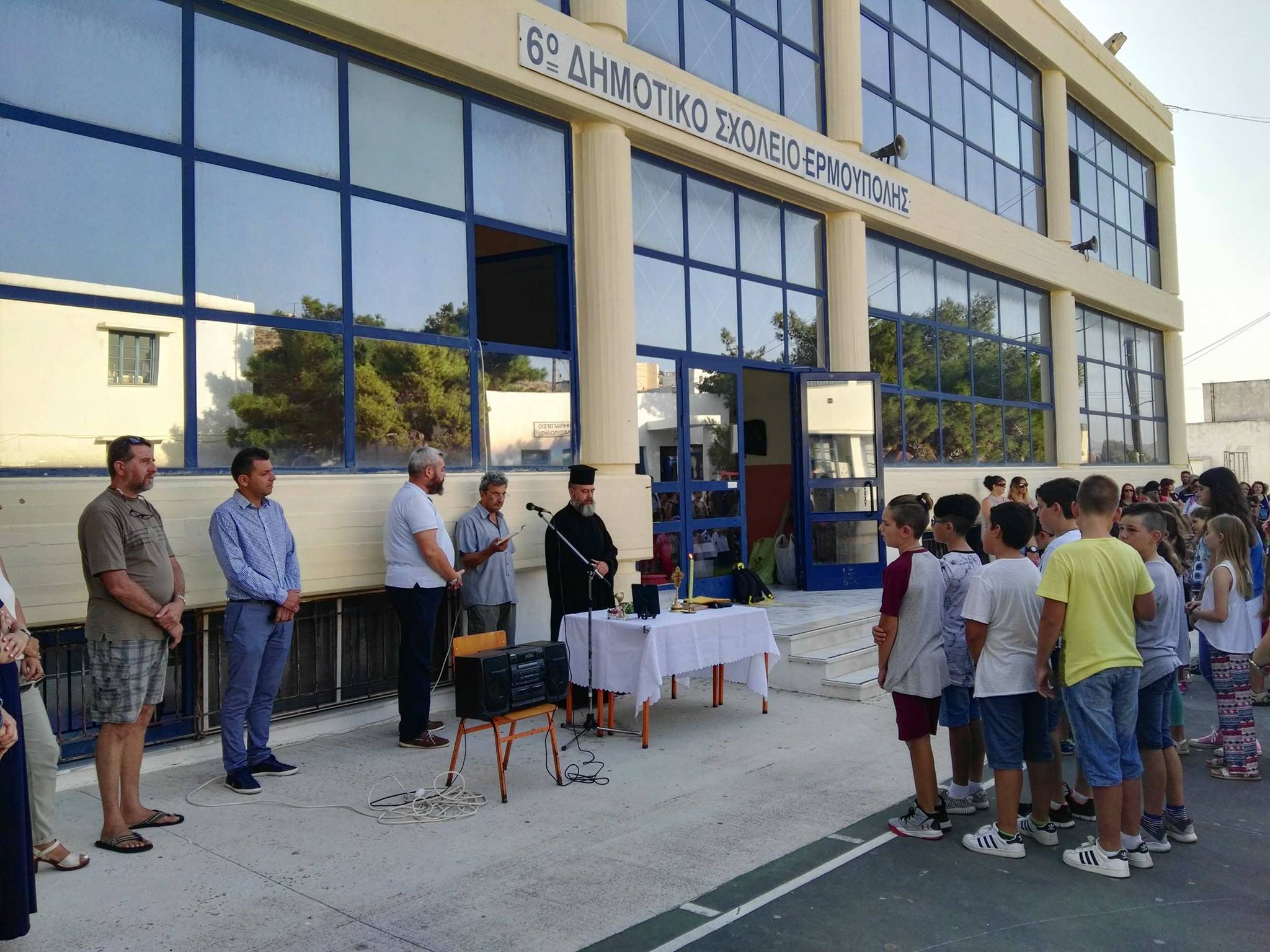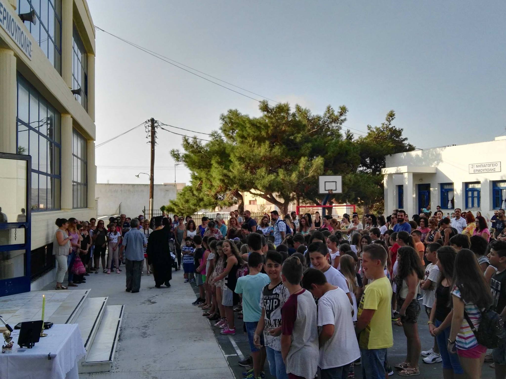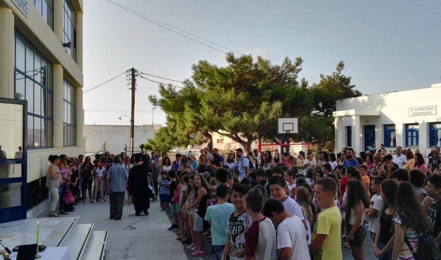 Τα προαύλια των Νηπιαγωγείων και των Δημοτικών Σχολείων της Σύρου “πλημμύρισαν” με παιδικές φωνές σήμερα το πρωί, οπότε και τελέσθηκε ο καθιερωμένος αγιασμός για την έναρξη του σχολικού έτους 2017 – 2018.
