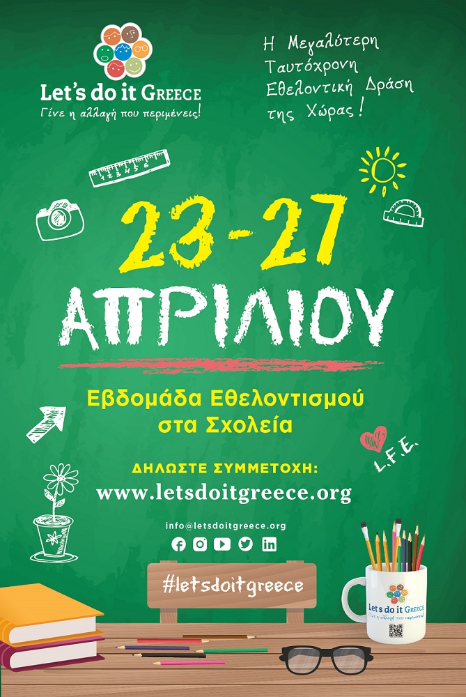 Με κεντρικό σύνθημα “Γίνε η αλλαγή που περιμένεις” , η πανελλαδική εκστρατεία “Let’s do it Greece” είναι μία προσπάθεια η οποία ξεκίνησε από νέα παιδιά, μαθητές περιβαλλοντικής ομάδας σχολείου, που αγάπησαν τον εθελοντισμό μέσα από το σχολείο και τώρα έχει εξελιχθεί στη Μεγαλύτερη Ταυτόχρονη Περιβαλλοντική Δράση της χώρας.