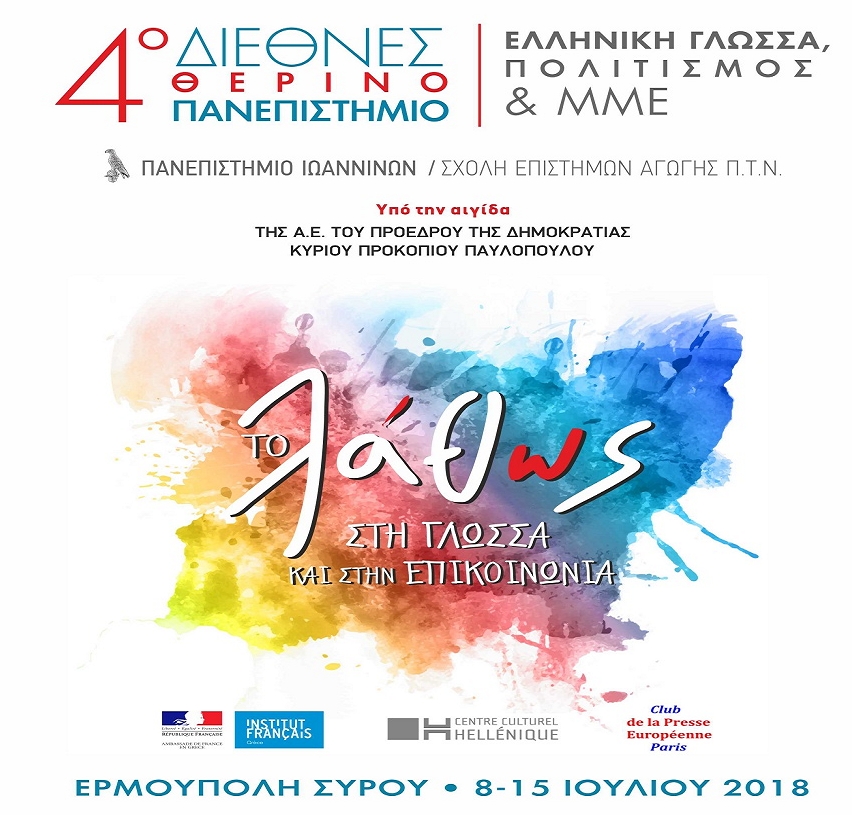 Μετά από 3 χρόνια αναγνωρισμένης επιτυχίας της διοργάνωσης στην Άνδρο, το πρόγραμμα του 2018 θα διεξαχθεί στο νησί της Σύρου, με τη συνέργεια του Δήμου, από 8-15 Ιουλίου. Το 4ο Διεθνές Θερινό Πανεπιστήμιο φέρει φέτος τον ειδικότερο τίτλο: Το λάθος στη γλώσσα και την επικοινωνία - H προσφορά και η δυναμική της παρέκκλισης θΘα καλύψει μεταξύ άλλων τις ακόλουθες θεματικές: Γλωσσικά και ορθογραφικά λάθη. Η Επιστήμη της Γλωσσολογίας απέναντι στο λάθος. Η ορθογραφία ως φορέας γλωσσικής μνήμης. Τα συνηθέστερα γραμματικά λάθη στον προφορικό και γραπτό λόγο των φυσικών ομιλητών της κοινής Νέας Ελληνικής. Τα λάθη του σήμερα «κανόνες» του αύριο; Τα συνήθη λάθη στην πολιτική επικοινωνία και η επίδρασή τους σε πολυσχιδή ακροατήρια. Δημοσιογραφικός λόγος και γλωσσικά/ορθογραφικά λάθη. Η επίδραση των ΜΜΕ στη γλώσσα των αποδεκτών. Η παιδευτική λειτουργία του δημοσιογραφικού λόγου. Η έννοια του λάθους στα μέσα κοινωνικής δικτύωσης. Η περίπτωση των fake news. Η δυναμική και η προσφορά του λάθους στην εξέλιξη της γλώσσας.