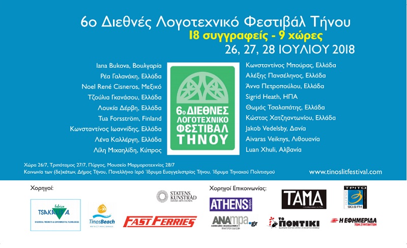 Τα διεθνή φεστιβάλ μας διανοίγουν τους ορίζοντες, μας κάνουν εξωστρεφείς, μας βγάζουν από τον προσωπικό και μας πάνε στο συλλογικό χρόνο. Ταυτόχρονα μας ταξιδεύουν σε άλλους τόπους, καθιστώντας μας κοινωνούς άλλων πολιτισμών. Την Πέμπτη 26 Ιουλίου 2018, στο Ίδρυμα Τηνιακού Πολιτισμού, στη Χώρα της Τήνου, γίνεται η έναρξη το 6ου Διεθνούς Λογοτεχνικού Φεστιβάλ Τήνου, με 18 συγγραφείς και ποιητές από 8 χώρες. Την Παρασκευή το φεστιβάλ μεταφέρεται στον Τριπόταμο και το Σάββατο στο Μουσείο Μαρμαροτεχνίας στον Πύργο. Σε εποχές κρίσεις όπως η σημερινή, ο πολιτισμός είναι ζωτικός παράγοντας για την κοινωνική συνοχή. H λογοτεχνία φωτίζει τις ζωές μας και μας κάνει να νιώθουμε ότι είμαστε ακόμα εδώ, ζωντανοί. Τα πέντε πρώτα Διεθνή Λογοτεχνικά Φεστιβάλ Τήνου έθεσαν τις βάσεις για το δίπολο «Τουρισμός-Πολιτισμός», με απώτερο σκοπό και μακροπρόθεσμο στόχο να καταστεί η Τήνος, εκτός του θρησκευτικού, τόπος και προορισμός πνευματικού / καλλιτεχνικού τουρισμού. Είναι σημαντικό αυτός ο φάρος πολιτισμού που άναψε στην Τήνο το καλοκαίρι του 2010 να μην σβήσει και με υψηλό αίσθημα ευθύνης είμαστε αποφασισμένοι, εμείς της Κοινωνίας των (δε)κάτων, να συνεχίσουμε. Εφέτος συμμετέχουν οι πεζογράφοι και ποιητές Κωνσταντίνος Ιωαννίδης, Λένα Καλλέργη, Ανθή Μαρωνίτη, Γιάννα Μπούκοβα (Βουλγαρία), Νοέλ Ρενέρ Σισνέρος (Μεξικό), Αλέξης Πανσέληνος, Λουκία Δέρβη, Τζούλια Γκανάσου, Tούα Φόρστρομ (Φινλανδία), Ζίγκριτ Χηθ (ΗΠΑ), Λίλη Μιχαηλίδη (Κύπρος), Κωνσταντίνος Μπούρας, Τζάκομπ Βέντελσμπι (Δανία), Ρέα Γαλανάκη, Άννα Πετροπούλου, Λουάν Τζούλι (Αλβανία), Θωμάς Τσαλαπάτης και Κώστας Χατζηαντωνίου. Με την ευγενική υποστήριξη του Ελληνικού Οργανισμού Τουρισμού.