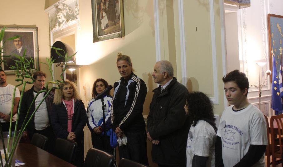 Τη χαρά της για την παρουσία της στη Σύρο εξέφρασε η Ολυμπιονίκης του στίβου στη σκυταλοδρομία των 4x400 το 2004 και Αντισμήναρχος της Ελληνικής Αεροπορίας, Δήμητρα Ντόβα, σημειώνοντας πως οι άνθρωποι του αθλητισμού θα αγωνίζονται πάντα για όλα όσα αγαπούν και πιστεύουν και για οτιδήποτε σηκώνει τη σημαία της χώρας μας ψηλά.