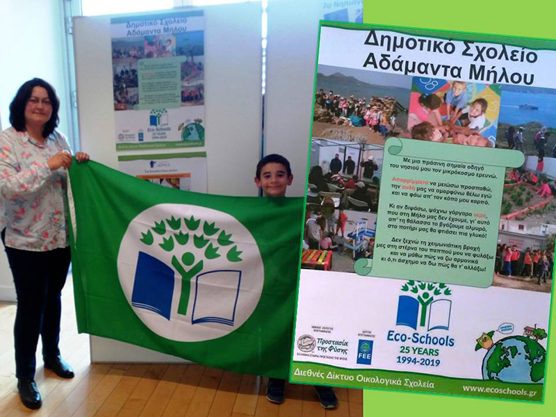 Για την επιτυχημένη συμμετοχή του στο Διεθνές Θεματικό Δίκτυο Περιβαλλοντικής Εκπαίδευσης «Οικολογικά Σχολεία» βραβεύτηκε για δεύτερη φορά το Δημοτικό Σχολείο Αδάμαντα Μήλου, παραλαμβάνοντας την πράσινη σημαία που φέρει το σήμα του προγράμματος.