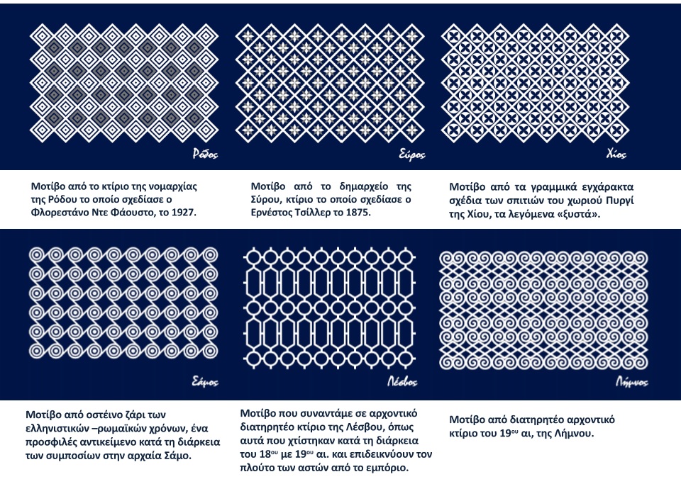Τα σχεδιαστικά μοτίβα που χρησιμοποιήθηκαν προέκυψαν από την μελέτη διαφόρων πολιτιστικών στοιχείων των νησιών του Αιγαίου και εφαρμόστηκαν στη συλλογή των αναμνηστικών αντικειμένων. Στον διαδικτυακό τόπο www.aegeanstore.gr διατίθενται στυλό, μπλοκ σημειώσεων, κούπες, καρφίτσες πέτου, σακίδια πλάτης, ομπρέλες, υφασμάτινες τσάντες, t-shirt, φούτερ, καπέλα ενώ νέα είδη είναι υπό σχεδιασμό. Το Αegeanstore υποστηρίζει ηλεκτρονικές πληρωμές και αποστολή σε όλη την Ελλάδα. Όλα τα είδη διατίθενται και για μαζική αγορά, σε προνομιακές τιμές, για την διοργάνωση θερινών σχολείων, συνεδρίων αλλά και στα μεταπτυχιακά προγράμματα του Πανεπιστημίου Αιγαίου.