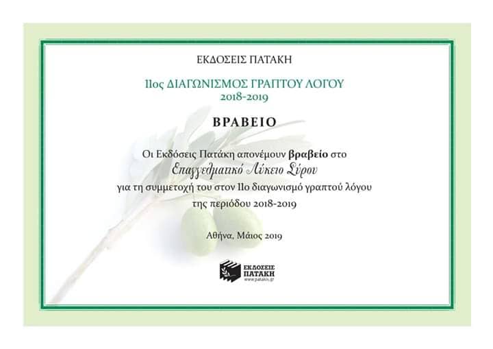 Οι προσδοκίες μας επαληθεύτηκαν με τη βράβευση του Επαγγελματικού Λυκείου Σύρου στον 11ο μαθητικό διαγωνισμό γραπτού λόγου που διοργανώθηκε από τις Εκδόσεις Πατάκη για τη χρονιά 2018-2019.