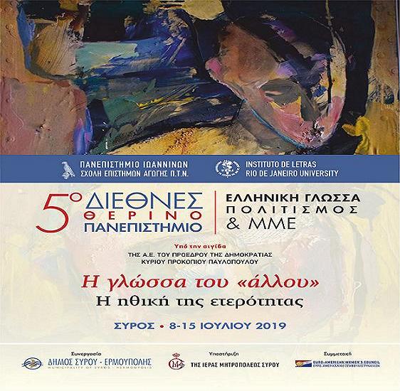 Ξεκινά τη Δευτέρα 8 Ιουλίου, στη Σύρο, τις εργασίες του το 5ο Διεθνές Θερινό Πανεπιστήμιο «Ελληνική Γλώσσα, Πολιτισμός και Μέσα Μαζικής Επικοινωνίας», που οργανώνεται από το Πανεπιστήμιο Ιωαννίνων – Παιδαγωγικό Τμήμα Νηπιαγωγών και το Rio De Janeiro University – Instituto de Letras. Στο πρόγραμμα θα παραστεί και θα μιλήσει η Α.Ε. του Προέδρος της Δημοκρατίας κύριος Προκόπιος Παυλόπουλος, ενώ θα συμμετάσχουν Πρυτάνεις και Αντιπρυτάνεις Πανεπιστημίων από την Ελλάδα και την Κύπρο. Το πρόγραμμα, που φέτος θα έχει ειδικότερο τίτλο «Η γλώσσα του άλλου. Η ηθική της ετερότητας», θα διεξάγεται έως και τις 15 Ιουλίου στην Έπαυλη Τσιροπινά στην Ποσειδωνία, με τη συμμετοχή 70 φοιτητών και 40 Καθηγητών από ελληνικά και ξένα Πανεπιστήμια (όπως το Harvard και το Stanford). Το παρόν θα δώσουν αντιπροσωπείες από την Αμερική, με κυρίαρχη την ομάδα του Euro – American Women’s Council, την Αυστραλία, και την Ευρώπη. Υψηλοί και οι προσκεκλημένοι από τη Βραζιλία, με επικεφαλής την καθηγήτρια Fernanda Lemos De Lima. Πιθανότατα το 5ο Δ.Θ.Π. θα τιμήσει με την παρουσία του και ο Αρχιεπίσκοπος Ελλάδος κ. Ιερώνυμος, ενώ πλήθος δημοσιογράφων από εγχώρια και διεθνή μέσα πρόκειται να παρακολουθήσουν τη σημαντική αυτή διοργάνωση.