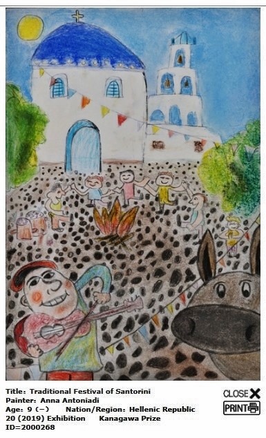 Στο φετινό διαγωνισμό συμμετείχαν 27.599 παιδιά από διάφορες χώρες του κόσμου. Ανάμεσα στα έργα που απέσπασαν το βραβείο Kanagawa, είναι και το έργο της Άννας Αντωνιάδη, εμπνευσμένο από το παραδοσιακό πανηγύρι του Κλήδονα, εκδήλωση η οποία πραγματοποιείται κάθε χρόνο στις 23 Ιουνίου, τόσο στη Σαντορίνη όσο και σε πολλά άλλα νησιά των Κυκλάδων.