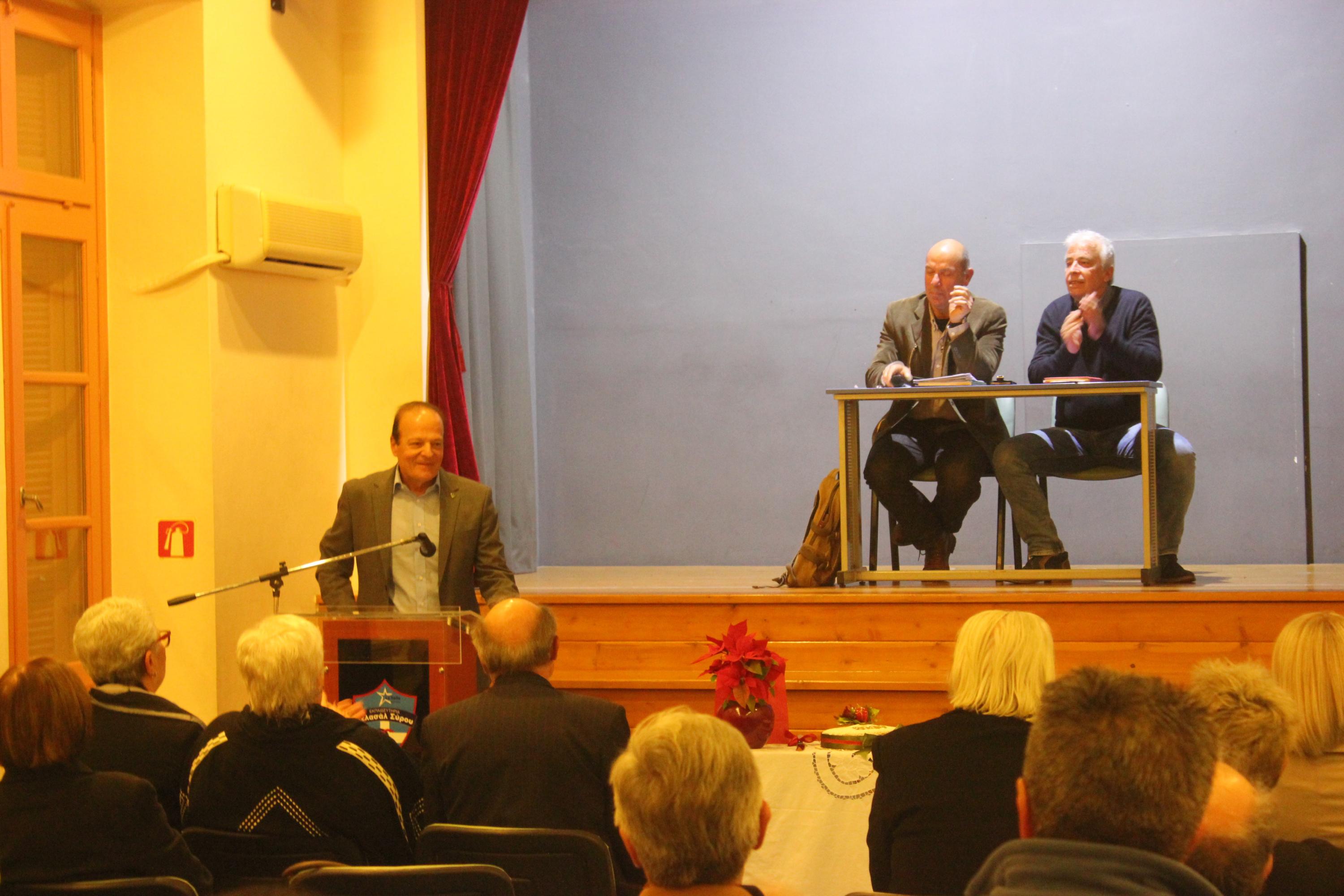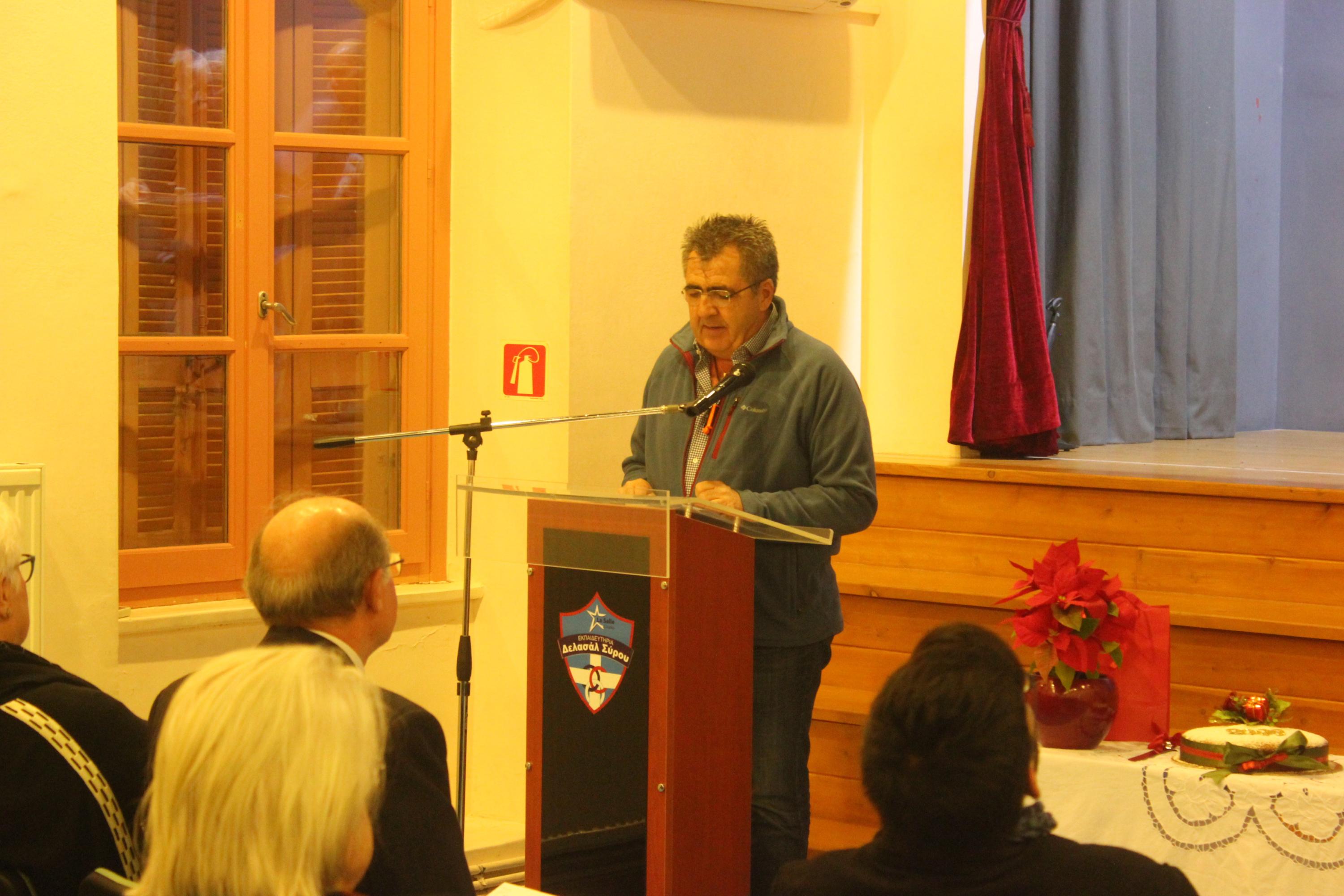 Το κύριο μέρος της εκδήλωσης προλόγισε ο Αντιπρόεδρος του Συλλόγου κ. Γιώργος Βακόνδιος. Όπως ανέφερε, στην πορεία του Ιδιωτικού Δημοτικού Σχολείου «Άγιος Γεώργιος», τον πρώτο αιώνα λειτουργίας του, πολλοί Frères και λαϊκοί εκπαιδευτικοί υπηρέτησαν τη λασαλιανή αποστολή στην Ελλάδα και ειδικότερα στο νησί της Σύρου. Αρκετοί από τους Φρερ, κατά τη διάρκεια της ζωής τους, από προσωπική επιλογή διαφοροποιήθηκαν και αποχώρησαν από τις τάξεις των μοναχών αδελφών του τάγματος χωρίς βέβαια να αποποιηθούν τις παιδαγωγικές αρχές στις οποίες είχαν μυηθεί, ζώντας και προσφέροντας πολλά χρόνια μέσα στα λασαλιανά σχολεία. Σύμφωνα με τον κ. Βακόνδιο, «η εσωστρεφής νοοτροπία των τότε ιθυνόντων του τάγματος στη χώρα μας δεν τους επέτρεψε να συνεχίσουν με την ιδιότητα του λαϊκού τις υπηρεσίες τους, επιλέγοντας αντί αυτών δασκάλους άσχετους με τις αρχές των λασαλιανών σχολείων, ορισμένοι από τους οποίους αμφιβόλου ηθικής και ικανοτήτων». Η μετέπειτα αλλαγή νοοτροπίας έδωσε τη δυνατότητα σε ικανά στελέχη μέσα από το λασαλιανό δίκτυο ως λαϊκοί, σε συνεργασία με τους Frères να αναπτύξουν και να εκσυγχρονίσουν τα σχολεία.