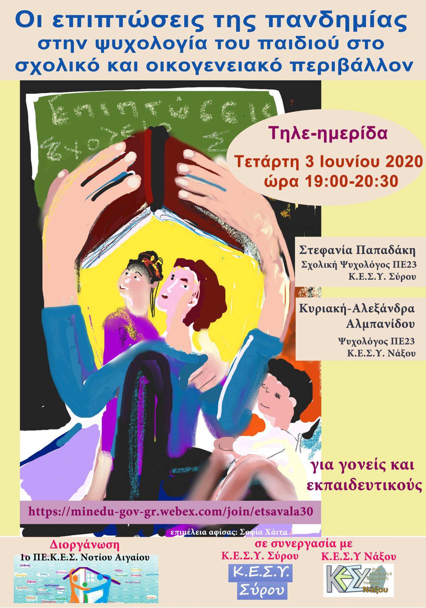 Στο πλαίσιο των επιμορφωτικών δράσεων του 1ου ΠΕ.Κ.Ε.Σ. Νοτίου Αιγαίου και σε συνεργασία με τα Κ.Ε.Σ.Υ. Σύρου και Νάξου και με αφορμή τη σταδιακή επαναλειτουργία των σχολικών μονάδων μετά την πανδημία του κορονοϊού πραγματοποιήθηκε τηλε-ημερίδα για γονείς και εκπαιδευτικούς την Τετάρτη 3 Ιουνίου 2020 και ώρα 19:00 – 20:30 με θέμα: «Οι επιπτώσεις της πανδημίας στην ψυχολογία του παιδιού στο σχολικό και οικογενειακό περιβάλλον». Εισηγήτριες ήταν η σχολική ψυχολόγος από το Κ.Ε.Σ.Υ. Σύρου, Στεφανία Παπαδάκη, και η ψυχολόγος από το Κ.Ε.Σ.Υ. Νάξου, Κυριακή – Αλεξάνδρα Αλμπανίδου.