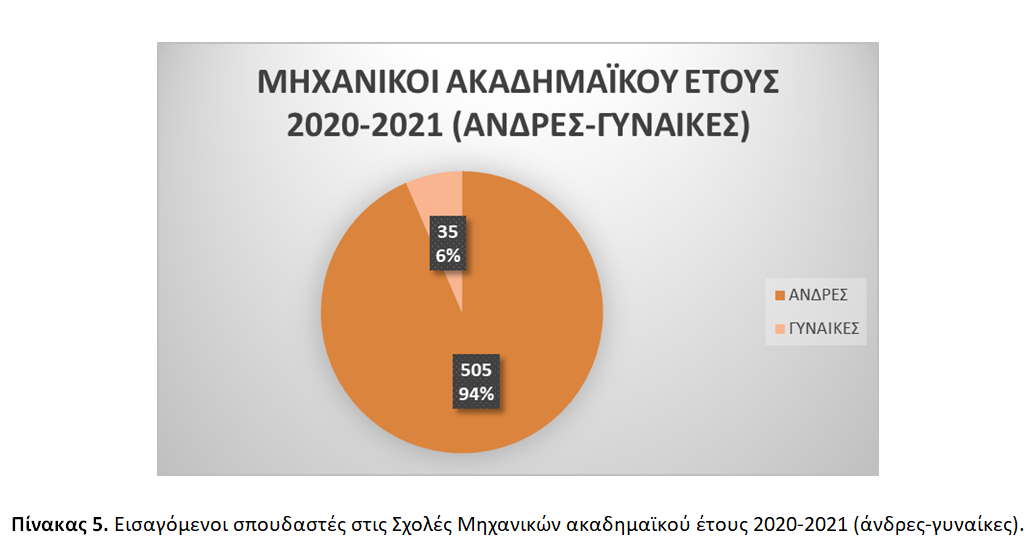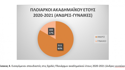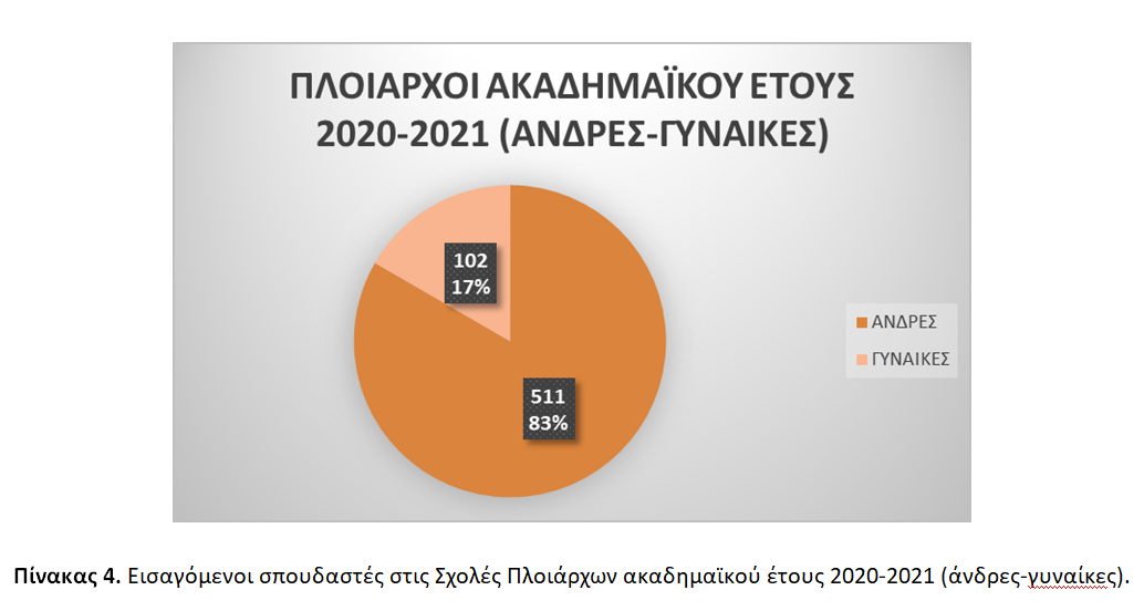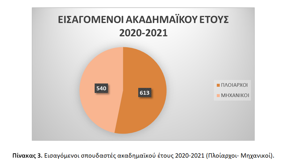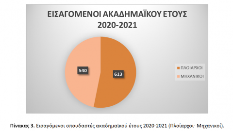 Συγκεκριμένα, εισάγονται συνολικά 1.153 σπουδαστές/σπουδάστριες (1.016 άνδρες / 137 γυναίκες), 613 Πλοίαρχοι (511 άνδρες / 102 γυναίκες) και 540 Μηχανικοί (505 άνδρες / 35 γυναίκες) [βλ. Πίνακες 3, 4, και 5].