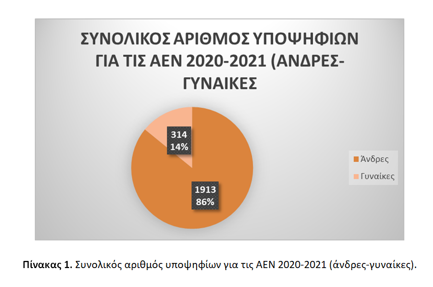 Συνολικά υποβλήθηκαν από υποψήφιους/υποψήφιες για τις Ακαδημίες Εμπορικού Ναυτικού, 2.229 αιτήσεις υποψηφίων, εκ των οποίων έγιναν δεκτές οι 2.227 (1.913 άνδρες και 314 γυναίκες), δεδομένου ότι δύο (02) εξ’ αυτών απορρίφθηκαν λόγω μη υγειονομικής καταλληλόλητας για φοίτηση σε ΑΕΝ/Πλοιάρχων ή Μηχανικών [βλ. Πίνακα 1].
